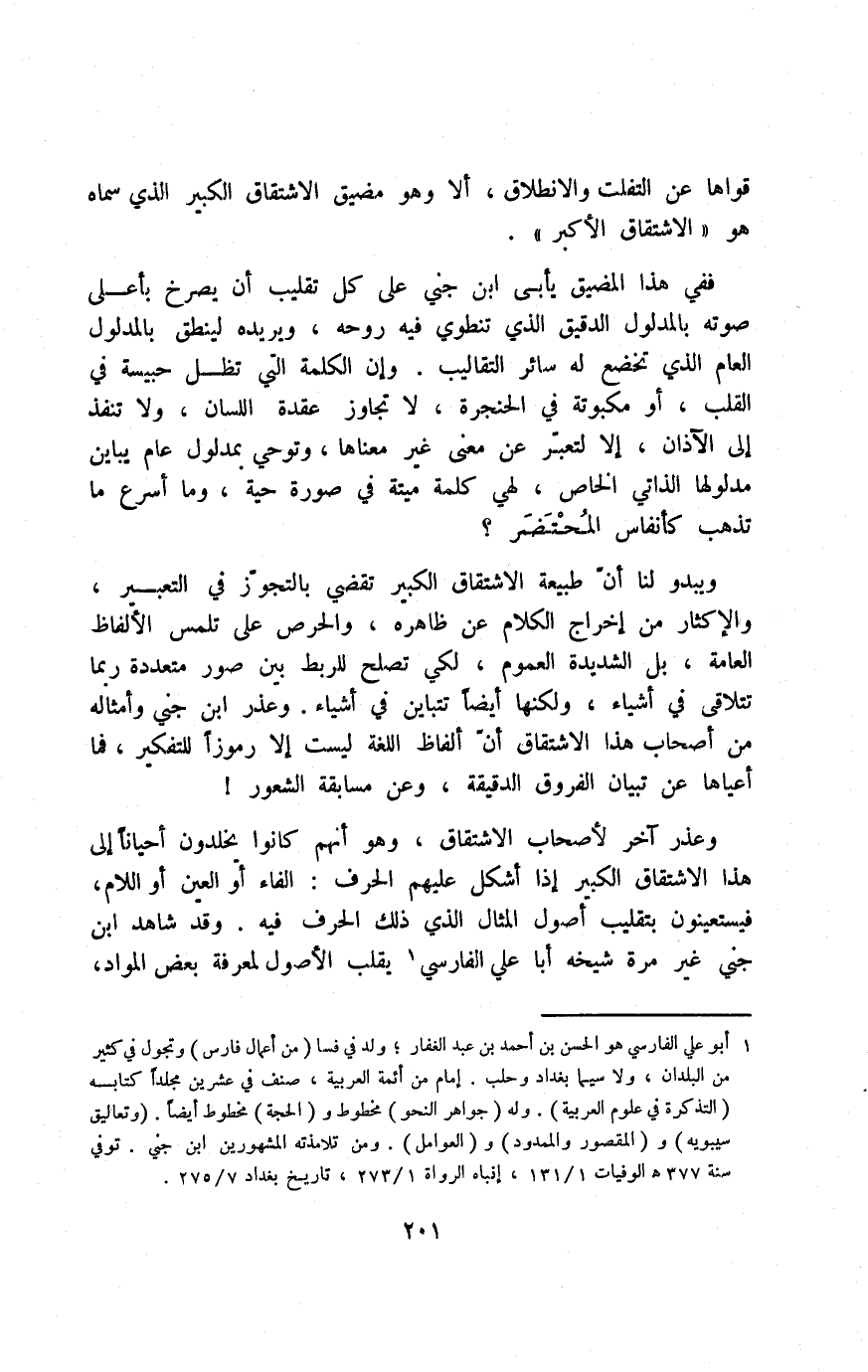 ويبد لنا أن طبيعة الاشتقاق الكبير تقضي بالتجوز في التعبير والإكثار من إخراج الكلام عن ظاهره، والحرص على تلمس الألفاظ العامة، بل الشديدة العموم، لكي تصلح للربط بين صور متعددة, ربما تتلاقى في أشياء، ولكنها أيضًا تتباين في أشياء, وعذر ابن جني وأمثاله من أصحاب هذا الاشتقاق أن ألفاظ اللغة ليست إلّا رموزًا للتفكير، فما أعياها عن تبيان الفروق الدقيقة، وعن مسابقة الشعور!