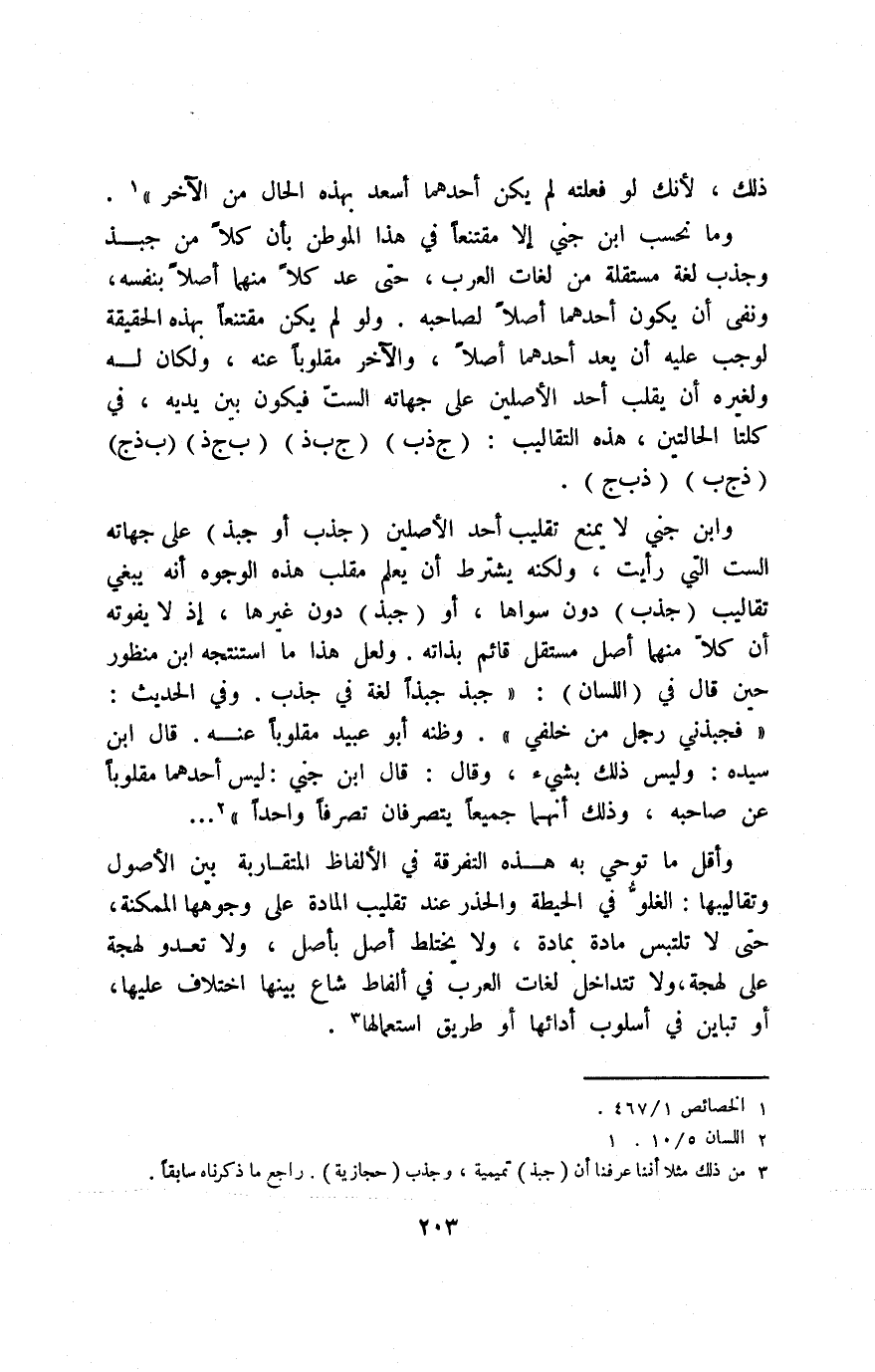 وما نسحب ابن جني إلّا مقتنعًا في هذا الموطن بأن كلًّا من جبذ وجذب لغة مستقلة من لغات العرب، حتى عَدَّ كلًا منهما أصلًا بنفسه, ونفى أن يكون أحدهما أصلًا لصاحبه، ولو لم يكن مقتنعًا بهذه الحقيقة لوجب عليه أن يعد أحدهما أصلًا، والآخر مقلوبًا عنه، ولكان له ولغيره أن يقلب أحد الأصلين على جهاته الست, فيكون بين يديه، في كلتا الحالتين، هذه التقاليب: "ج ذ ب", "ج ب ذ", "ب ج ذ", "ب ذ ج", "ذ ج ب", "ذ ب ج".