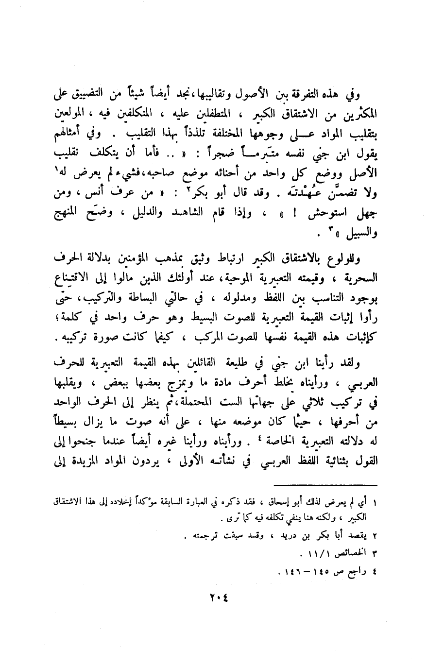 ولقد رأينا ابن جني في طليعة القائلين بهذه القميمة التعبيرية، للحرف العربي، ورأيناه يخلط أحرفَ مادةٍ ما, ويمزج بعضها ببعض، ويقلبها في تركيبٍ ثلاثيٍّ على جهاتها الست المحتملة، ثم ينظر إلى الحرف الواحد من أحرفها، حيثما كان موضعها منها، على أنه صوت ما يزال بسيطًا, له دلالته التعبيرية الخاصة4. ورأيناه ورأينا غيره أيضًا عندما جنحوا إلى القول بثنائية اللفظ العربي في نشأته الأولى، يردون المواد المزيدة إلى
