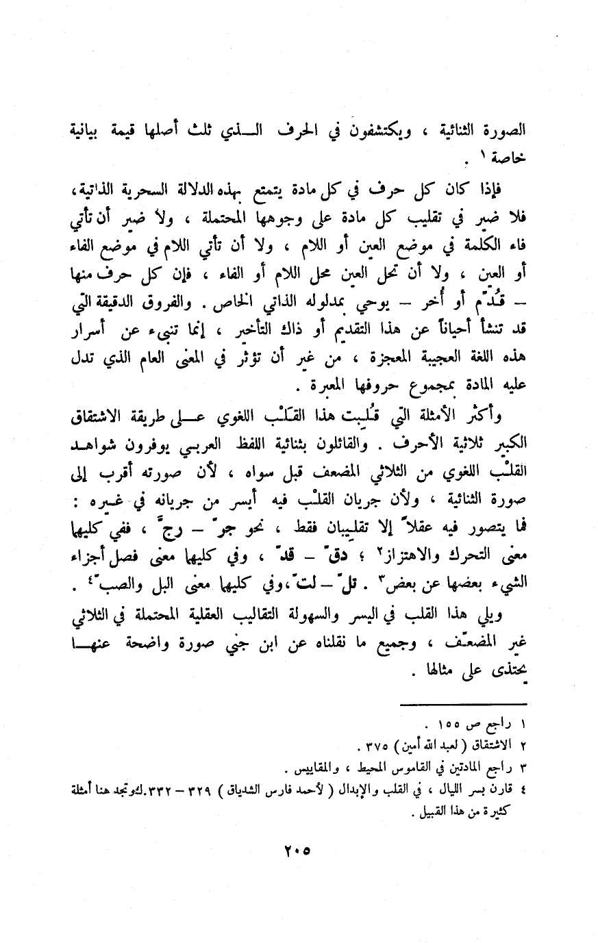 فإذا كان حرفٍ في كلِّ مادةٍ يتمتع بهذه الدلالة السحرية الذاتية، فلا ضير في تقليب كل مادة على وجوها المحتملة، ولا ضير أن تأتي فاء الكلمة في موضع العين أو اللام، ولا أن تأتي اللام في موضع الفاء أو العين، ولا أن تحلَّ العين محل اللام أو الفاء، فإن كل حرف منها -قُدِّمَ أو أُخِّرَ- يوحي بمدلوله الذاتي الخاص، والفروق الدقيقة التي قد تنشأ أحيانًا عن هذا التقديم أو ذاك التأخير، إنما تنبيء عن أسرار هذه اللغة العجيبة المعجزة، من غير أن تؤثر في المعنى العام الذي تدل عليه المادة بمجموع حروفها المعبرة.