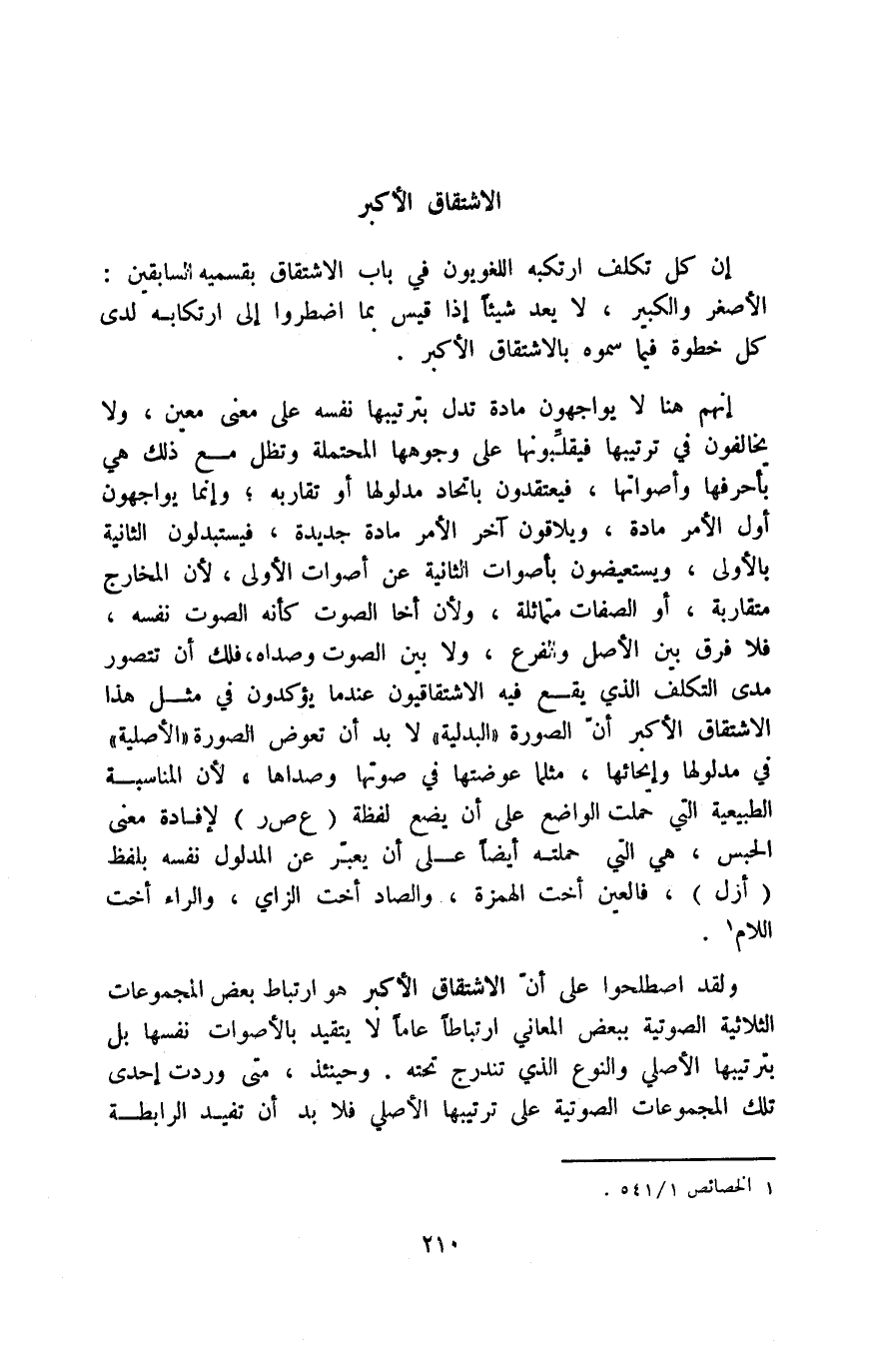 إنهم هنا لا يواجهون مادةً تدل بترتيبها نفسه على معنًى، ولا يخالفون في ترتيبها فيقلبونها على وجوهها المحتملة, وتظل مع ذلك هي بأحرفها وأصواتها، فيعتقدون باتحاد مدلولها أو تقاربه؛ وإنما يواجهون أول الأمر مادة، ويلاقون آخر الأمر مادةً جديدة، فيستبدلون الثانية بالأولى، ويستعيضون بأصوات الثانية عن أصوات الأولى، لأن المخارج متقاربة، أو الصفات متماثلة، ولأن أخا الصوت كأنه الصوت نفسه، فلا فرق بين الأصل والفرع، ولا بين الصوت وصداه، فلك أن تتصور مدى التكلف الذي يقع فيه الاشتقاقيون عندما يؤكدون في مثل هذا الاشتقاق الأكبر أن الصورة "البدلية" لا بد أن تعوض الصورة "الأصلية" في مدلولها وإيحائها، مثلما عوضتها في صوتها وصداها؛ لأن المناسبة الطبيعية التي حملت الواضع على أن يضع لفظة "ع ص ر" لإفادة معنى الحبس، هي التي حملته أيضًا على أن يعبر عن المدلول نفسه بلفظ "أزل"، فالعين أخت الهمزة، والصاد أخت الزاي، والراء أخت اللام1.