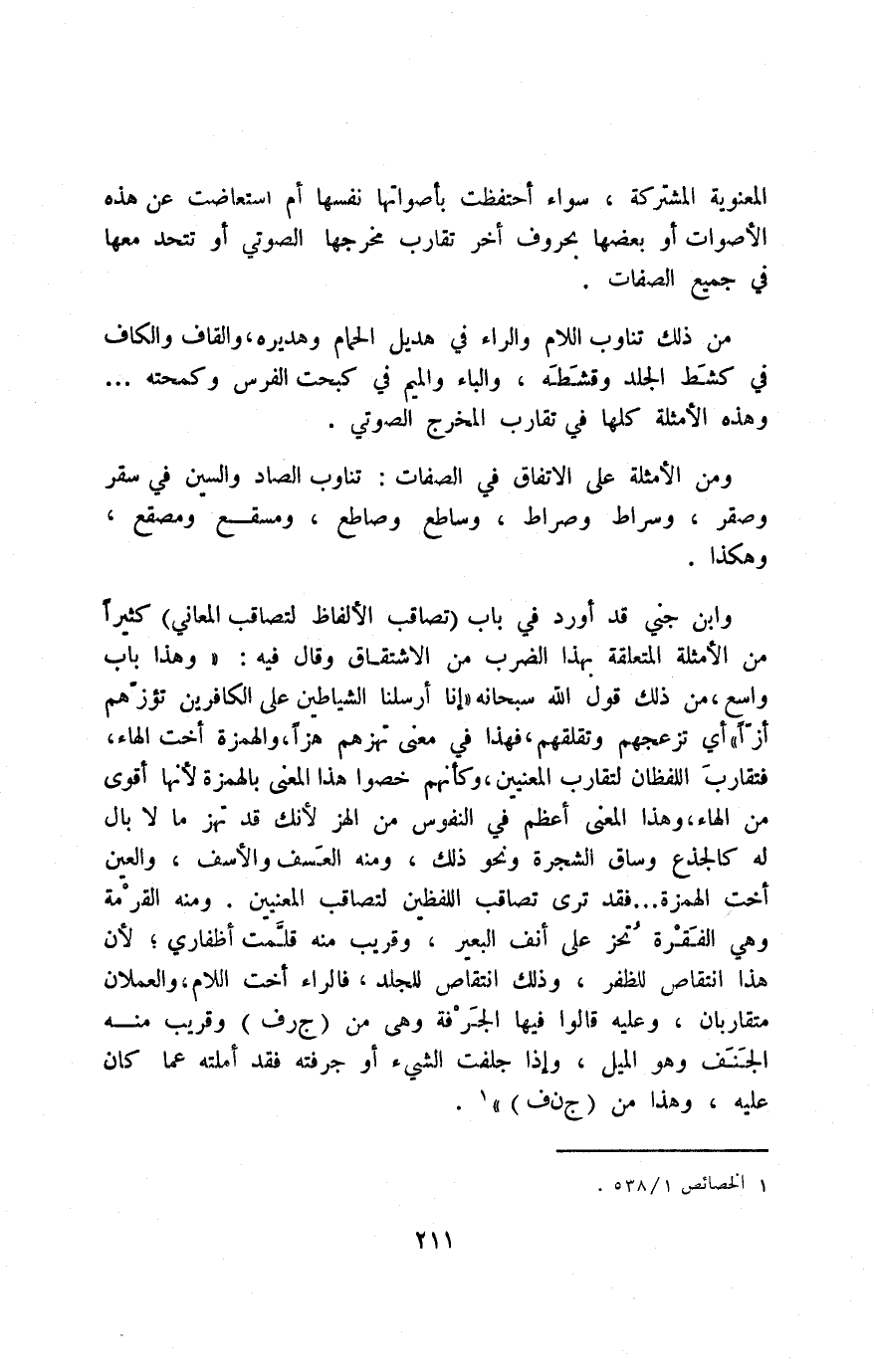 وابن جني قد أورد في باب "تصاقب الألفاظ لتصاقب المعاني" كثيرًا من الأمثلة المتلعقة بهذا الضرب من الاشتقاق, وقال فيه: "وهذا باب واسع، من ذلك قوله الله سبحانه: {أَنَّا أَرْسَلْنَا الشَّيَاطِينَ عَلَى الْكَافِرِينَ تَؤُزُّهُمْ أَزًّا} أي: تزعجهم وتقلقهم، فهذا في معنى تهزهم هزًّا، والهمزة أخت الهاء, فتقارب اللفظان لتقارب المعنيين، وكأنهم خصوا هذا المعنى بالهمزة لأنها أقوى من الهاء، وهذا المعنى أعظم في النفوس من الهز؛ لأنك قد تهزّ ما لا بال له؛ كالجذع وساق الشجرة ونحو ذلك، ومنه العسف والأسف، والعين أخت الهمزة؛ فقد ترى تصاقب اللفظين لتصاقب المعنيين, ومنه القَرْمة وهي الفقرة تُحز على أنف البعير، وقريب منه قلمت أظفاري؛ لأن هذا انتقاص للظفر، وذلك انتقاص للجلد، فالراء أخت اللام، والعملان متقاربان، وعليه قالوا فيه الجَرْفَة وهي من "ج ر ف", وقريب منه الجَنَفَ وهو الميل، وإذا جلفت الشيء أو جرفته, فقد أملته عما كان عليه، وهذا من "ج ن ف"1.