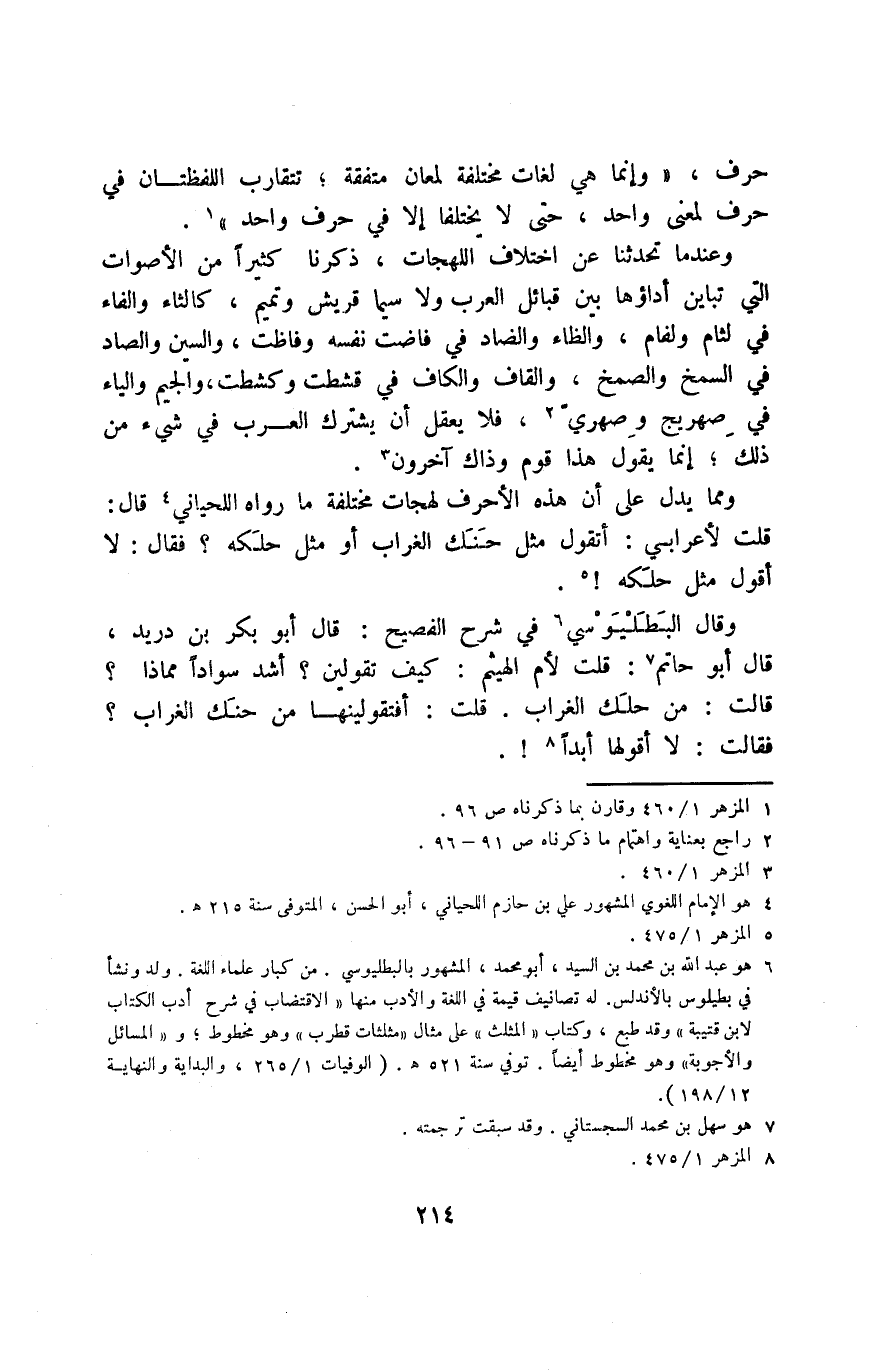 ومما يدل على أن هذه الأحرف لهجات مختلفة ما رواه اللحياني 4 قال: قلت لأعرابيّ: أتقول مثل حَنَك الغراب أو مثل حلَكه؟ فقال: لا أقول مثل حَلَكه! 5