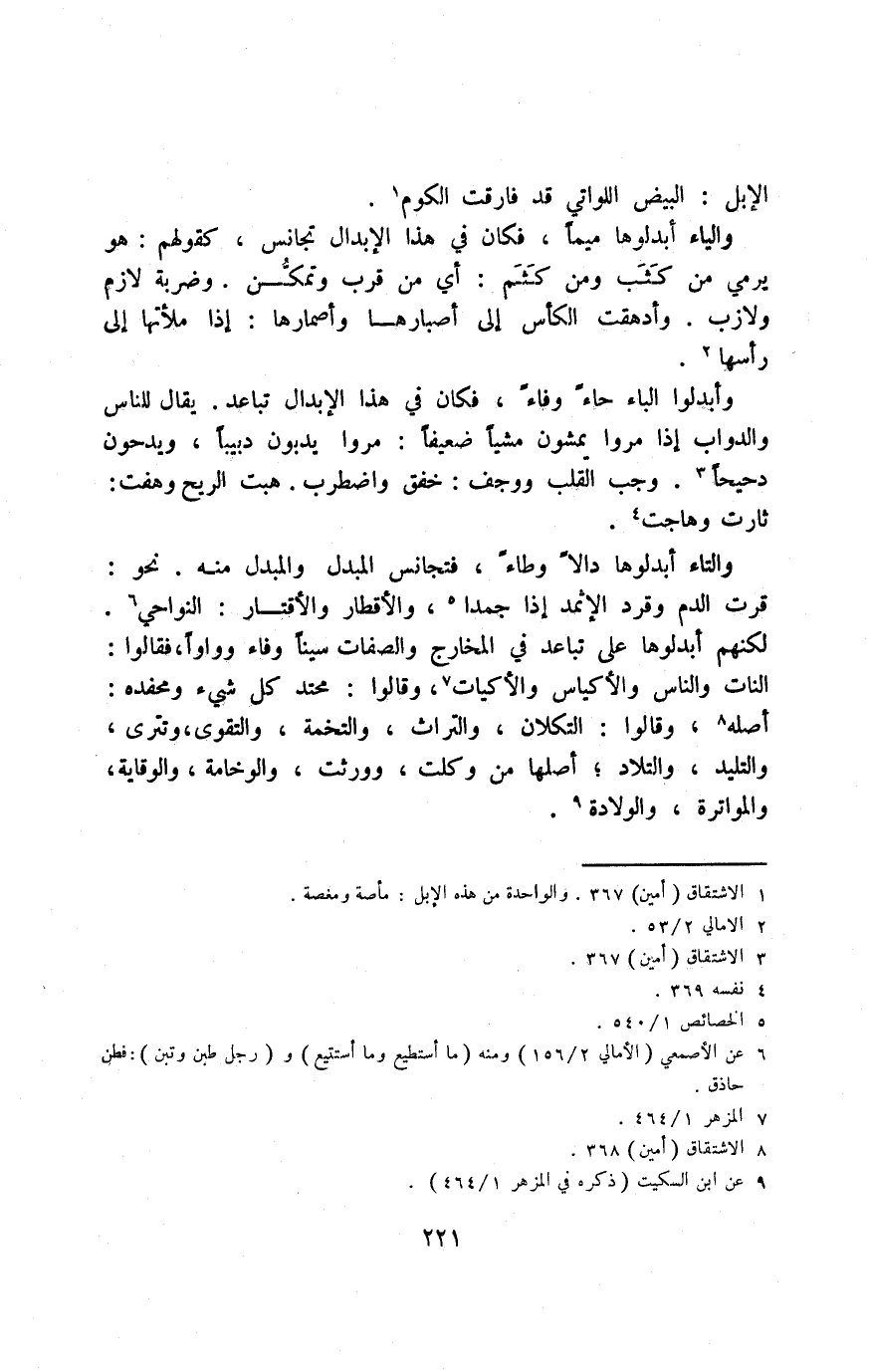 لكنهم أبدلوها على تباعد في المخارج والصفات سينًا وفاء وواوًا, فقالوا: النات والناس والأكياس والأكيات7، وقالوا: محتد كل شيء ومحفدة: أصله8، وقالوا: التكلان، والتراث، والتخمة، والتقوى وتترى، والتليد، والتلاد؛ أصلها من وكلت، وورثت، والوخامة، والوقاية، والمواترة، والولادة 9.