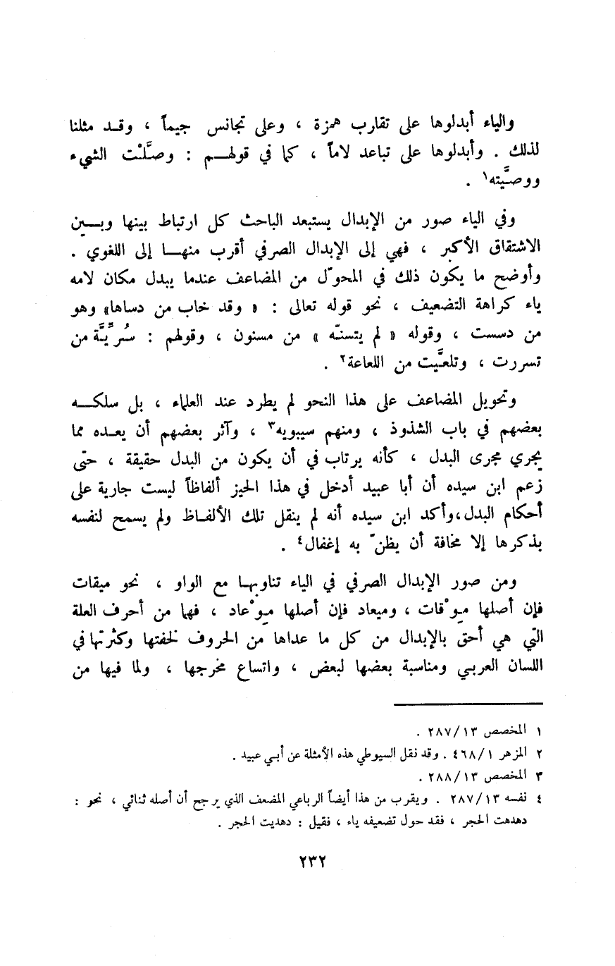 4 نفسه 13/ 278. ويقرب من هذا أيضًا الرباعي المضعف الذي يرجح أن أصله ثنائي، نحو: دهدهت الحجر، فقد حول تضعيفه ياء، فقيل: دهديت الحجر.