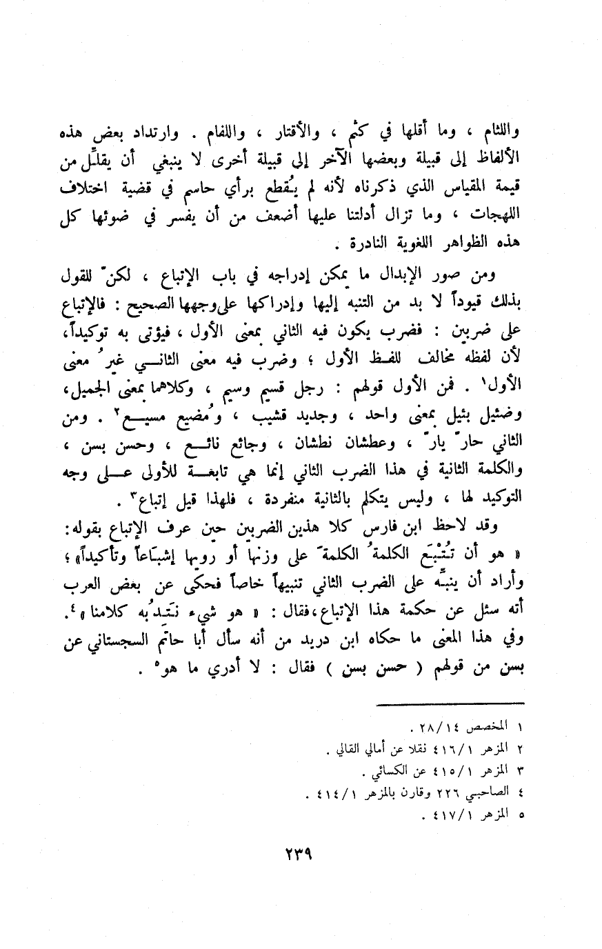 وقد لاحظ ابن فارس كلا هذين الضربين حين عرف الإتباع بقوله: "وهو أن تتبع الكلمةُ الكلمةَ على وزنها أو رويها إشباعًا وتأكيدًا"؛ وأراد أن ينبه على الضرب الثاني تنبيهًا خاصًّا فحكي عن بعض العرب أنه سئل عن حكمة هذا الإتباع، فقال: "هو شيء نتدبه كلامنا"4. وفي هذا المعنى ما حكاه ابن دريد من أنه سأل أبا حاتم السجستاني عن بسن من قولهم "حسن بسن" فقال: لا أدري ما هو5.