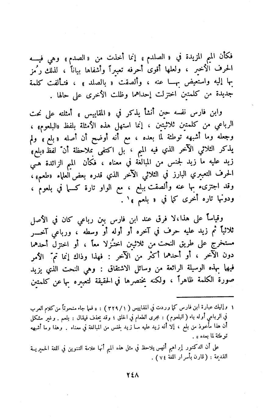 وابن فارس نفسه حين أنشأ يذكر في "المقاييس" أمثلته على نحت الرباعي من كلمتين ثلاثيتين، إنما استهل هذه الأمثلة بلفظ "البلعوم"، وجعله وما أشبهه توطئة لما بعده، مع أنه أوضح أن أصله "بلع" ولم يذكر الثلاثي الآخر الذي فيه الميم، بل اكتفى بملاحظة أن لفظ "بلع" زيد عليه ما زيد لجنس من المبالغة في معناه، فكأن الميم الزائدة هي الحرف التعبيري البارز في الثلاثي الآخر الذي قدره بعض العلماء "طعم"، وقد اجترئ بها عنه وألصقت ببلع، مع الواو تارة كما في بلعوم، ودونها تارة أخرى كما في "بلعم"1.