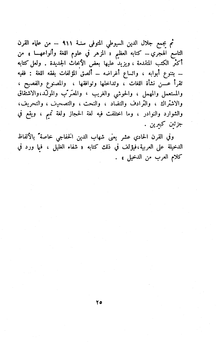 ثم يجمع جلال الدين السيوطي المتوفى سنة 911, من علماء القرن التاسع الهجري, كتابه العظيم "المزهر في علوم اللغة وأنواعها" من أكثر الكتب المتقدمة، ويزيد عليها بعض الأبحاث الجديدة, ولعل كتابه -بتنوع أبوابه، واتساع أغراضه- ألصق المؤلفات بفقه اللغة؛ ففيه تقرأ عن نشأة اللغات، وتداخلها, وتوافقها، والمصنوع والفصيح، والمستعمل والمهمل، والحوشي والغريب، والمعَرَّب والمولَّد، والاشتقاق والاشتراك، والترادف والتضاد، والنحت، والتصحيف، والتحريف، والشوارد والنوادر، وما اختلفت فيه لغة الحجاز ولغة تميم، ويقع في جزئين كبيرين.