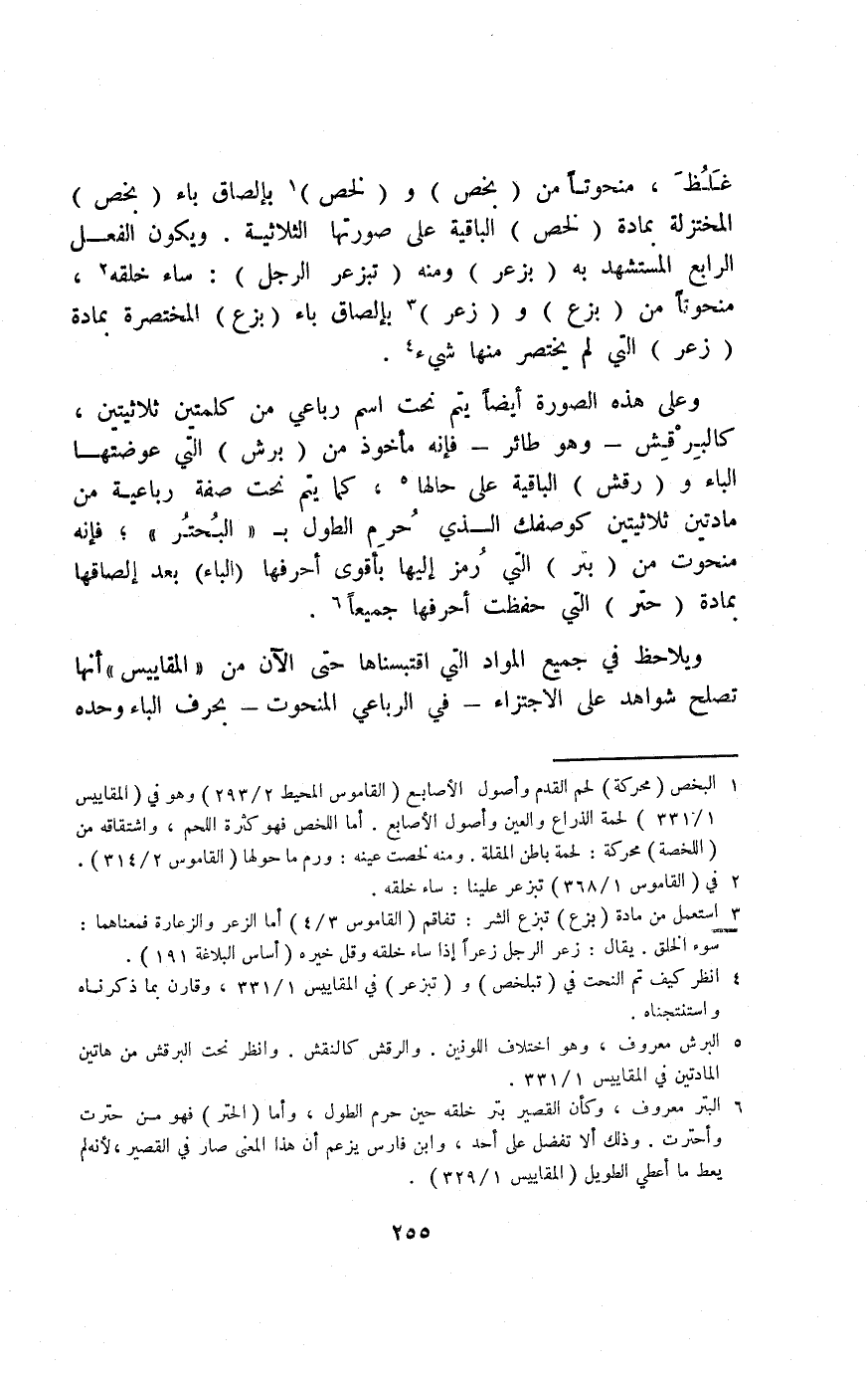 4 انظر كيف تم النحت في "تبلخص" و"تبزعر" في المقاييس 1/ 331، وقارن بما ذكرناه واستنتجناه.