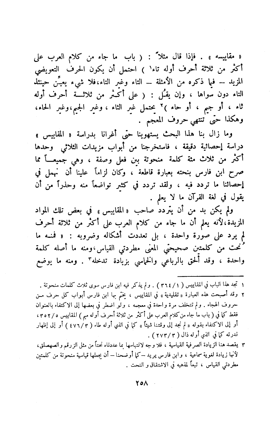 3 يقصد هنا الزيادة الصرفية القياسية، فلا وجه لالتباسها بما عددناه نحتًا من مثل الزرقم والصهصلق؛ لأنها زيادة لغوية سماعية، وابن فارس يريد -كما أوضحنا- أن يجعلها قياسية منحوتة من كلمتين مطردتي القياس، تبعًا لمذهبه في الاشتقاق والنحت.