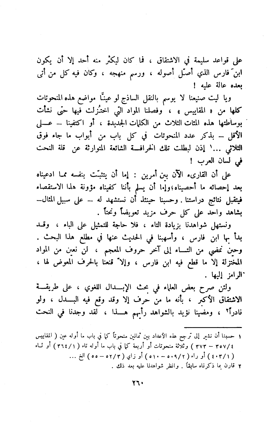 ويا ليت صنيعنا لا يوسم بالنقل الساذج لو عينَّا مواضع هذه المنحوتات كلها من "المقاييس"، وفصلنا المواد التي اختزلت فيها حتى نشأت بوساطتها هذه المئات الثلاث من الكلمات الجديدة، أو اكتفينا -على الأقل- بذكر عدد المنحوتات في كل باب من أبواب ما جاء فوق الثلاثي ... 1، إذن لبطلت تلك الخرافة الشائعة المتوارثة عن قلة النحت في لسان العرب!