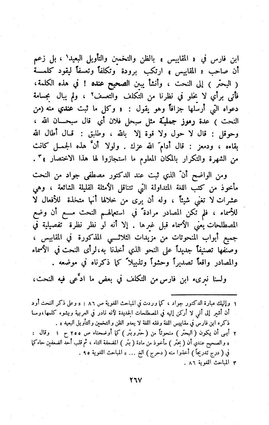 1 وإليك عبارة الدكتور جواد، كما وردت في المباحث اللغوية ص86: "وعلى ذكر النحت أود أن أشير إلى أني لا أركن إليه في المصطلحات الجديدة؛ لأنه نادر في العربية ويشوه كلمها، وما ذكره ابن فارس في مقاييس اللغة وفقه اللغة لا يعدو الظن والتخمين والتأويل البعيد".
