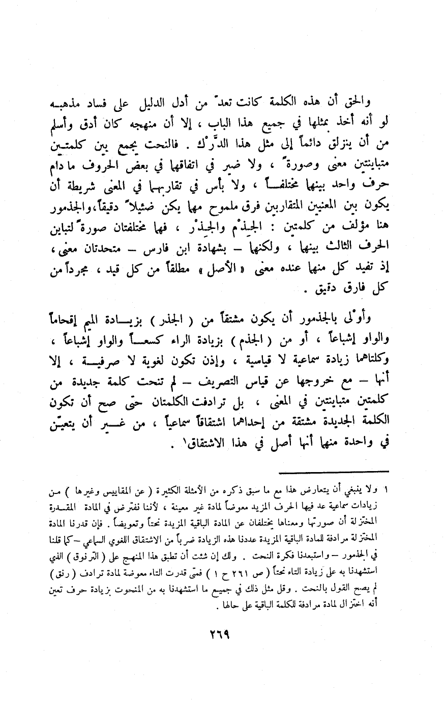 1 ولا ينبغي أن يتعارض هذا مع ما سبق ذكره من الأمثلة الكثيرة "عن المقاييس وغيرها" من زيادات سماعية عد فيه الحرف المزيد معوضًا لمادة غير معينة؛ لأننا نفترض في المادة المقدرة المختزلة أن صورتها ومعناها يختلفان عن المادة الباقية المزيدة نحتًا وتعويضًا. فإن قدرنا المادة المختزلة مرادفة للمادة الباقية المزيدة عددنا هذه الزيادة ضربًا من الاشتقاق اللغوي السماعي -كما قلنا في الجذمور- واستبعدنا فكرة النحت. ولك إن شئت أن تطبق هذا المنهج على "الترنوق" الذي استشهدنا به على زيادة التاء نحتًا "ص261 ح1" فمتى قدرت التاء معوضة لمادة ترادف "رنق" لم يصح القول بالنحت. وقل مثل ذلك في جميع ما استشهدنا به من المنحوت بزيادة حرف تعين أنه اختزال لمادة مرادفة للكلمة الباقية على حالها.