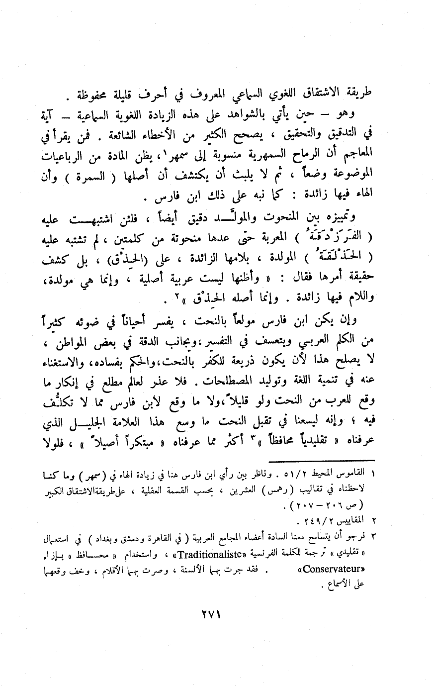 3 نرجو أن يتسامح معنا السادة أعضاء المجامع العربية "في القاهرة ودمشق وبغداد" في استعمال "تقليدي" ترجمة للكلمة الفرنسية Traditionaliste، واستخدام "محافظ" بإزاء Conservateur. فقد جرت بهما الألسنة، وصرت بهما الأقلام، وخفت وقعهما على الأسماع.