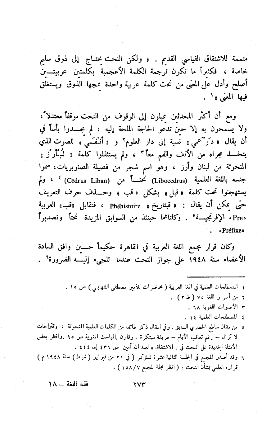 ومع أن أكثر المحدثين يميلون إلى الوقوف من النحت موقفًا معتدلًا، ولا يسمحون به إلا حين تدعو الحاجة الملحة إليه، لم يجدوا بأسًا في أن يقال "درعمي" نسبة إلى دار العلوم2 و"أنفمي" للصوت الذي يتخذ مجراه من الأنف والفم معًا3، ولم يستثقلوا كلمة "لُبْأرْز" المنحوتة من لبنان وأرز، وهو اسم شجر من فصلية الصنوبريات، سموا جنسه باللغة العلمية "Libocedrus" نحتًا من "Cedrus Liban"4 ولم يستهجنوا نحت كلمة "قبل" بشكل "قب" وحذف حرف التعريف حتى يمكن أن يقال: "قبتاريخ" Phehistoire" فتقابل "قب" العربية "pre" الإفرنجية5. وكلتاهما حينئذ من السوابق المزيدة نحتًا وتصديرًا "Perfixe".