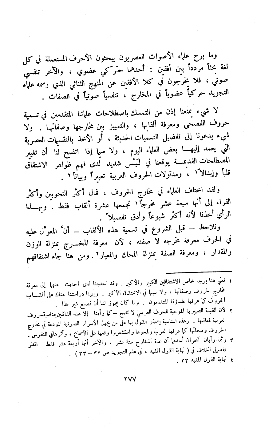1 نعني هنا بوجه خاص الاشتقاق الكبير والأكبر. وقد احتجنا لدى الحديث عنهما إلى معرفة مخارج الحروف وصفاتها. ولا سيما في الاشتقاق الأكبر. وبنينا دراستنا هناك على ألقاب الحروف كما عرفها علماؤنا المتقدمون. وما كان يجوز لنا أن نصنع غير هذا.