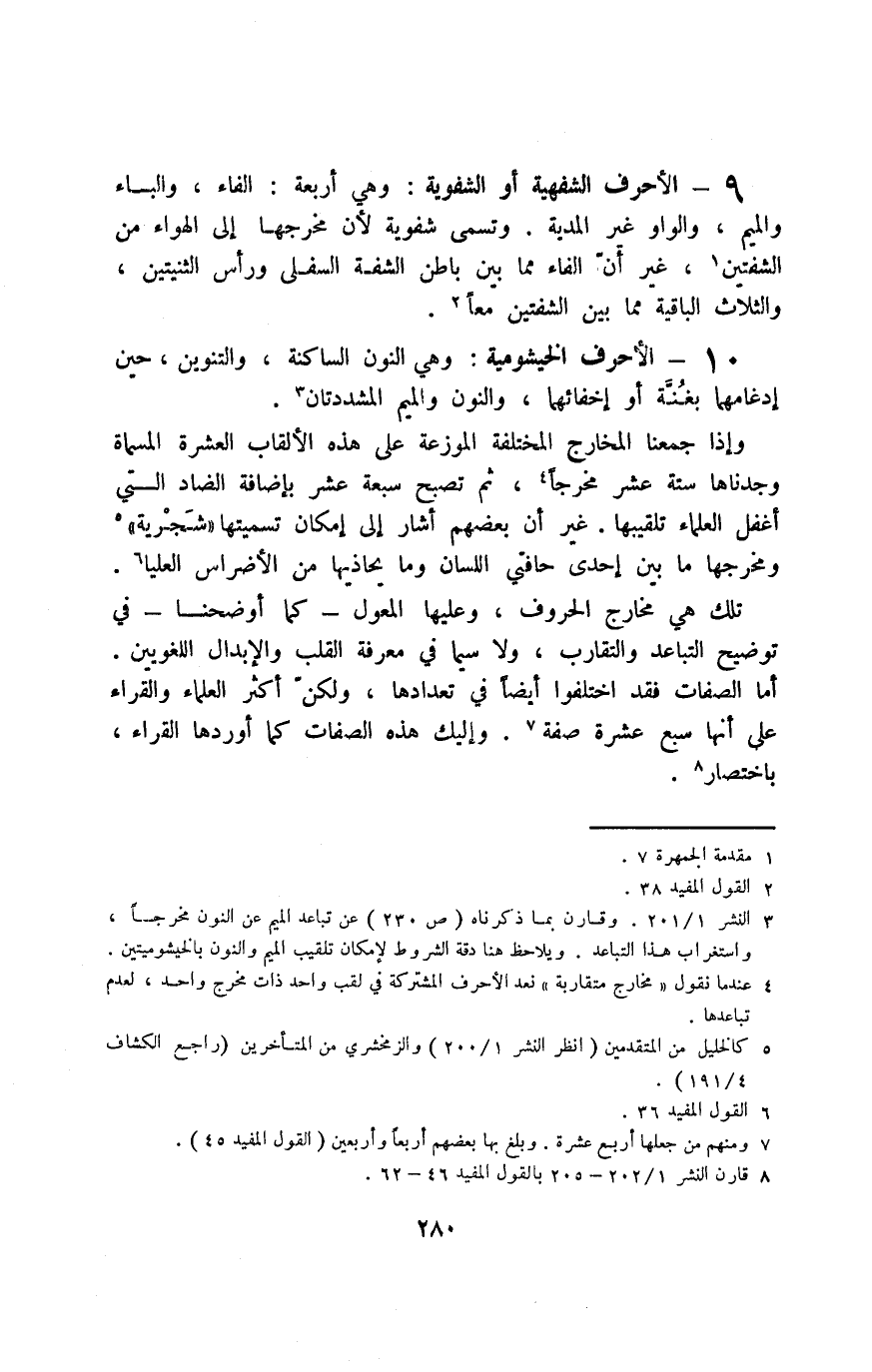3 النشر 1/ 201. وقارن بما ذكرناه "ص230" عن تباعد الميم عن النون مخرجًا، واستغرب هذا التباعد. ويلاحظ هنا دقة الشروط لإمكان تلقيب الميم والنون بالخيشوميتين.