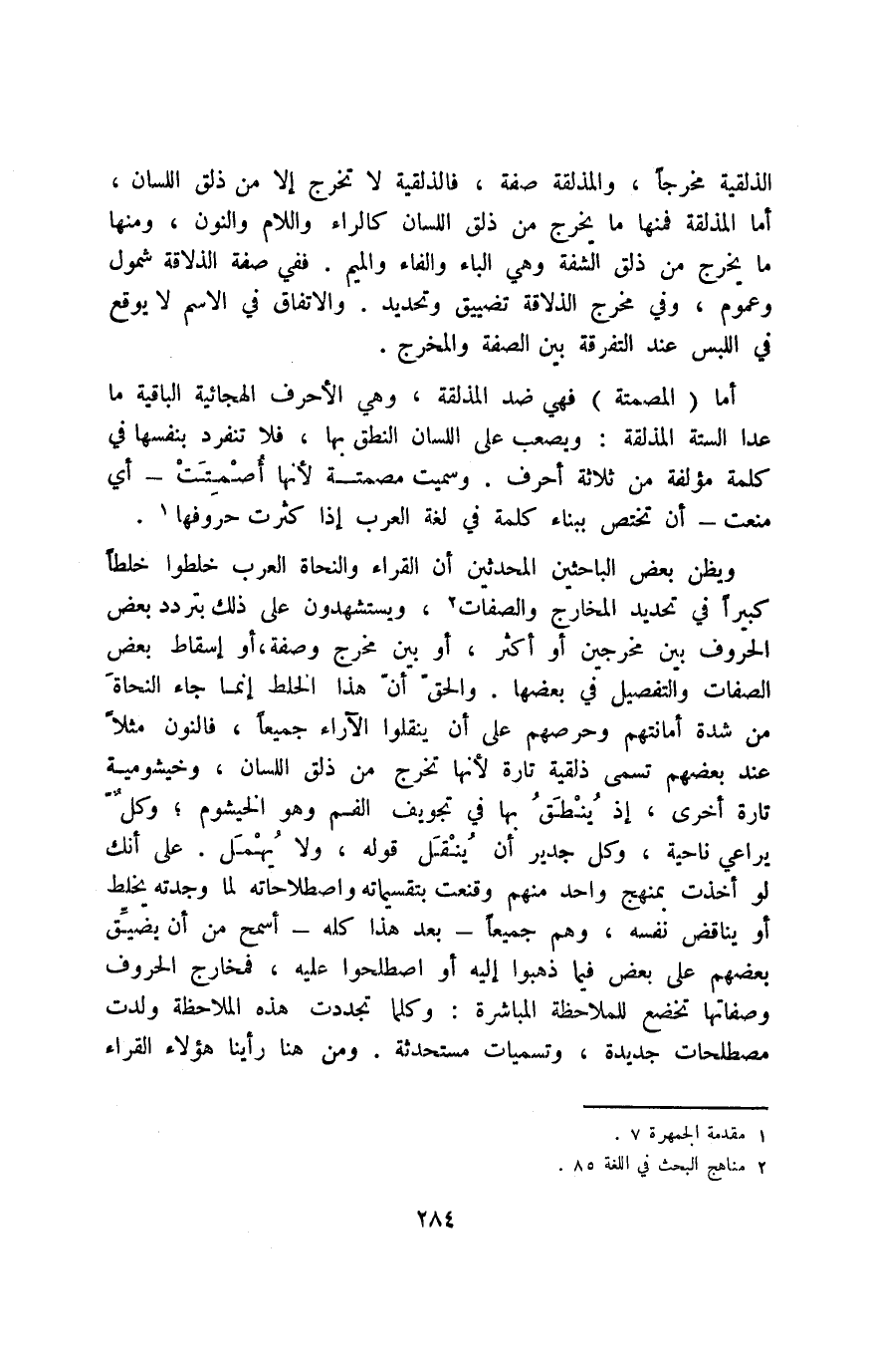 ويظن بعض الباحثين المحدثين أن القراء والنحاة العرب خلطوا خلطًا كبيرًا في تحديد المخارج والصفات2، ويستشهدون على ذلك بتردد بعض الحروف بين مخرجين أو أكثر، أو بين مخرج وصفة، أو إسقاط بعض الصفات والتفصيل في بعضها. والحق أن هذا الخلط إنما جاء النحاة من شدة أمانتهم وحرصهم على أن ينقلوا الآراء جميعًا، فالنون مثلًا عند بعضهم تسمى ذلقية تارة؛ لأنها تخرج من ذلق اللسان، وخيشومية تارة أخرى؛ إذ ينطق بها في تجويف الفم وهو الخيشوم؛ وكل يراعي ناحية، وكل جدير أن ينقل قوله، ولا يهمل. على أنك لو أخذت بمنهج واحد منهم وقنعت بتقسيماته واصطلاحاته لما وجدته يخلط أو يناقض نفسه، وهم جميعًا -بعد هذا كله- أسمح من أن يضيق بعضهم على بعض فيما ذهبوا إليه أو اصطلحوا عليه، فمخارج الحروف وصفاتها تخضع للملاحظة المباشرة، وكلما تجددت هذه الملاحظة ولدت مصطلحات جديدة، وتسميات مستحدثة، ومن هنا رأينا هؤلاء القراء -بعد تفصيل رأيهم في صفات الحروف مثلًا- ينبهون إلى التقسيمات الأخرى ويقولون بكثير من الحيطة والحذر: "وللحروف صفات أخرى غير مشهورة تركناها خوفًا من الإملال والتطويل"3.