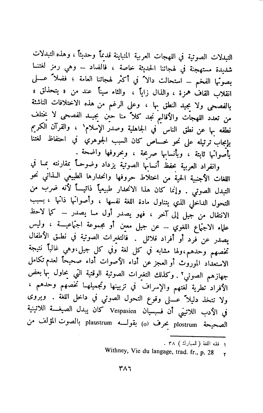 فإذا تركنا جانبًا هذه التغيرات الصوتية الناشئة عن نطق الأفراد في ظروف معينة لأسباب خاصة، وجدنا أن الانحدار الطبيعي الذاتي إلى أمثال هذه التغيرات في لغات العالم في مجموعاتها الكبرى واضح جدًّا وشائع ومعروف، على حين لا نرى له في العربية الفصحى أثرًا مهما يكن ضيئلًا؛ ففي كثير من اللغات يعتدي حرف على حرف، فيستبدل أحدهما بالآخر؛ لتأثير كلمة في أخرى: فالكاف اللاتينية "c" تنقلب في الفرنسية شينًا "ch" إذا وقعت قبل فتحة قديمة "a" مثال ذلك: