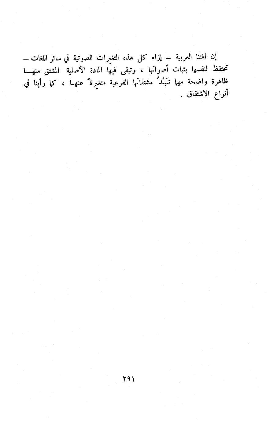 إن لغتنا العربية -إزاء كل هذه التغيرات الصوتية في سائر اللغات- تحتفظ لنفسها بثبات أصواتها، وتبقى فيها المادة الأصلية المشتق منها ظاهرة واضحة مهما تبدو مشتقاتها الفرعية متغيرة عنها، كما رأينا في أنواع الاشتقاق.