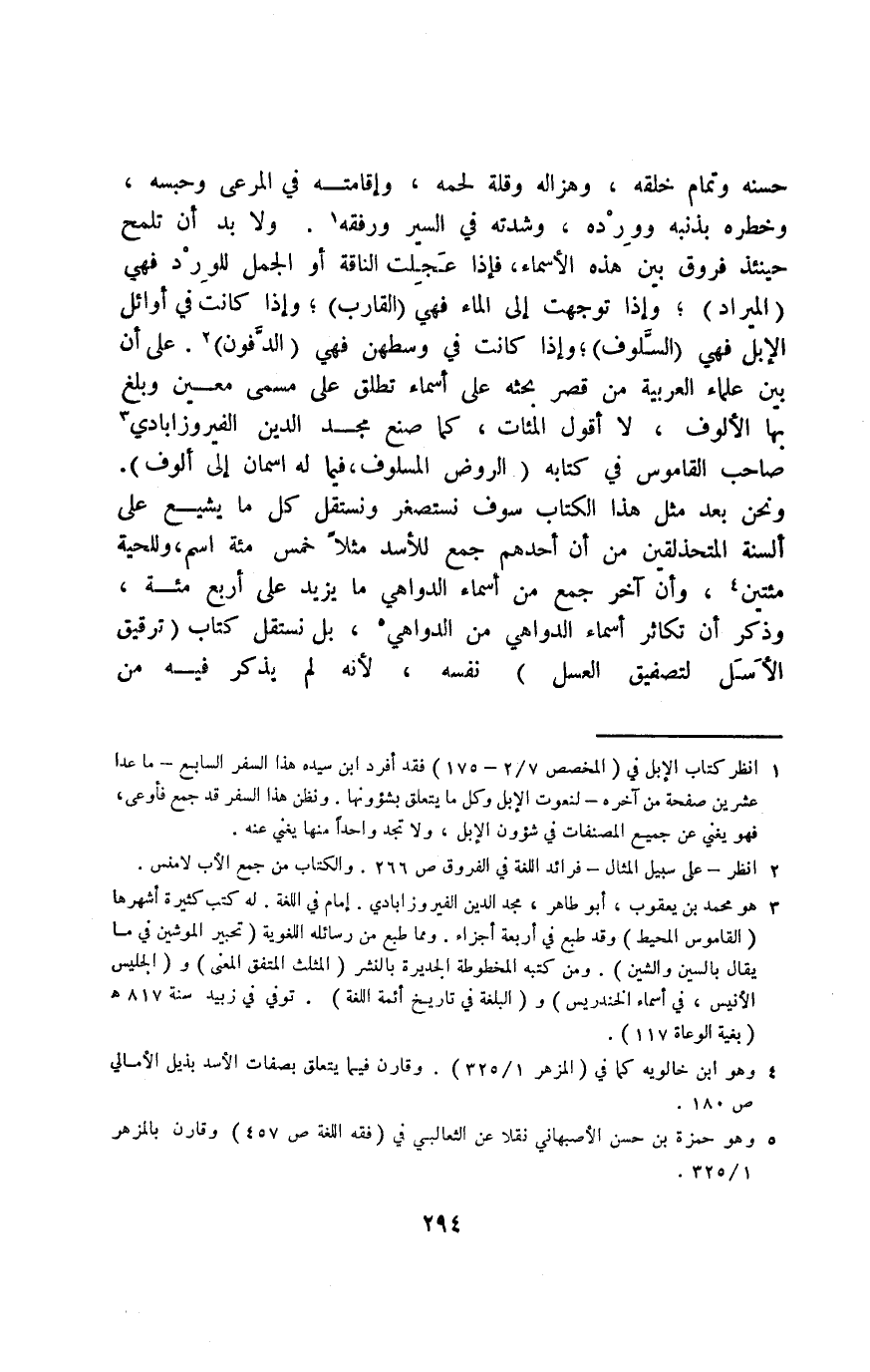 حسنه وتمام خلقه، وهزاله وقلة لحمه، وإقامته في المرعى وحبسه، وخطره بذنبه وورده، وشدته في السير ورفقه1. ولا بد أن تلمح حينئذ فروق بين هذه الأسماء، فإذا عجلت الناقة أو الجمل للورد فهي "الميراد"، وإذا توجهت إلى الماء فهي "القارب"، وإذا كانت في أوائل الإبل فهي "السَّلوف"، وإذا كانت في وسطهن فهي "الدَّفون"2. على أن بين علماء العربية من قصر بحثه على أسماء تطلق على مسمى معين وبلغ بها الألوف، لا أقول المئات، كما صنع مجد الدين الفيروزآبادي3 صاحب القاموس في كتابه "الروض المسلوف فيما له اسمان إلى ألوف". ونحن بعد مثل هذا الكتاب سوف نستصغر ونستقل كل ما يشيع على ألسنة المتحذلقين من أن أحدهم جمع للأسد مثلًا خمسمائة اسم، وللحية مائتين4، وأن آخر جمع من أسماء الدواهي ما يزيد على أربعمائة، وذكر أن تكاثر أسماء الدواهي من الدواهي5، بل نستقل كتاب "ترقيق الأَسَل لتصفيق العسل" نفسه؛ لأنه لم يذكر فيه من