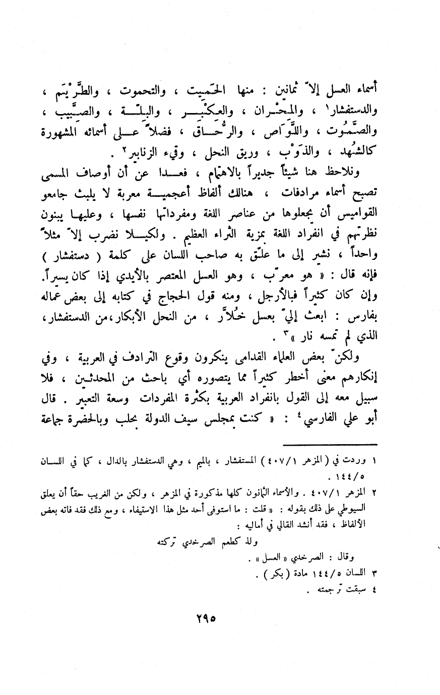 ونلاحظ هنا شيئًا جديرًا بالاهتمام، فعدا عن أن أوصاف المسمى تصبح أسماء مرادفات، هنالك ألفاظ أعجمية معربة لا يلبث جامعو القواميس أن يجعلوها من عناصر اللغة ومفرداتها نفسها، وعليها يبنون نظرتهم في انفراد اللغة بمزية الثراء العظيم. ولكيلا نضرب إلا مثلًا واحدًا، نشير إلى ما علق به صاحب اللسان على كلمة "دستفشار" فإنه قال: "هو معرب، وهو العسل المعتصر بالأيدي إذا كان يسيرًا. وإن كان كثيرًا فبالأرجل، ومنه قول الحجاج في كتابه إلى بعض عماله بفارس: ابعث إليَّ بعسل خُلار، من النحل الأبكار، من الدستفشار، الذي لم تمسه نار"3.