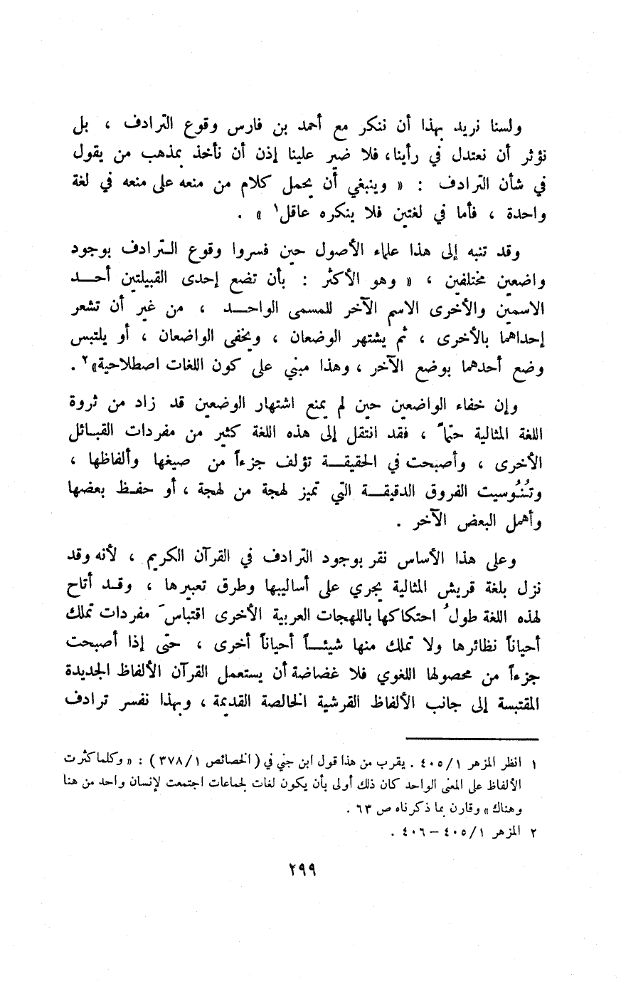 1 انظر المزهر 1/ 405. يقرب من هذا قول ابن جني في "الخصائص 1/ 378": "وكلما كثرت الألفاظ على المعنى الواحد كان ذلك أولى بأن يكون لغات لجماعات اجتمعت لإنسان واحد من هنا وهناك" وقارن بما ذكرناه ص63.