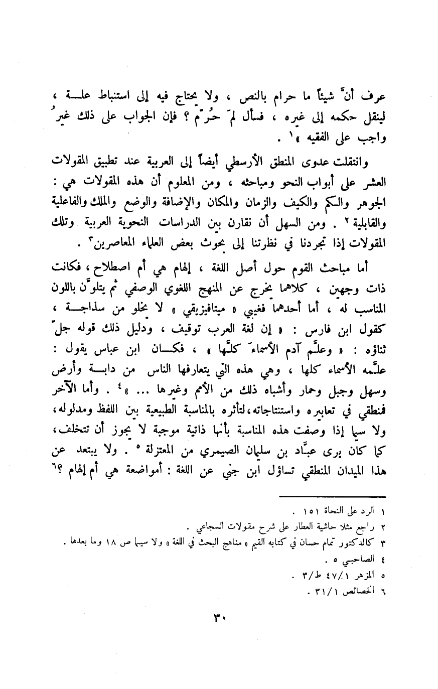 الجوهر والكم والكيف والزمان والمكان والإضافة والوضع والملك والفاعلية والقابلية2, ومن السهل أن نقارن بين الدراسات النحوية العربية وتلك المقولات إذا تجردنا في نظرتنا إلى بحوث بعض العلماء المعاصريين3.