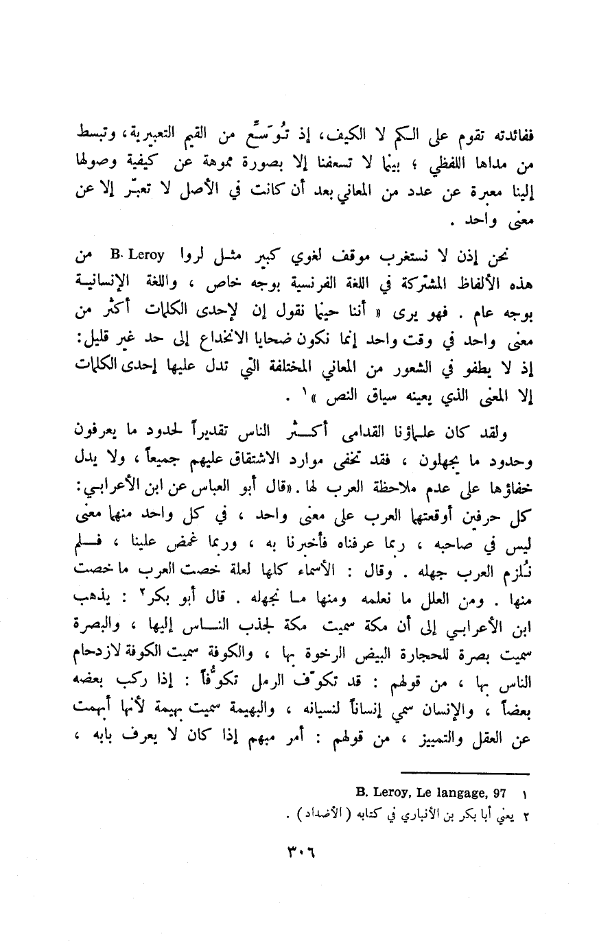 نحن إذن لا نستغرب موقف لغوي كبير مثل لروا B Leroy من هذه الألفاظ المشتركة في اللغة الفرنسية بوجه خاص، واللغة الإنسانية بوجه عام. فهو يرى "أننا حينما نقول: إن لإحدى الكلمات أكثر من معنى واحد في وقت واحد إنما تكون ضحايا الانخداع إلى حد غير قليل؛ إذ لا يطفو في الشعور من المعاني المختلفة التي تدل عليها إحدى الكلمات إلا المعنى الذي يعينه سياق النص"1.