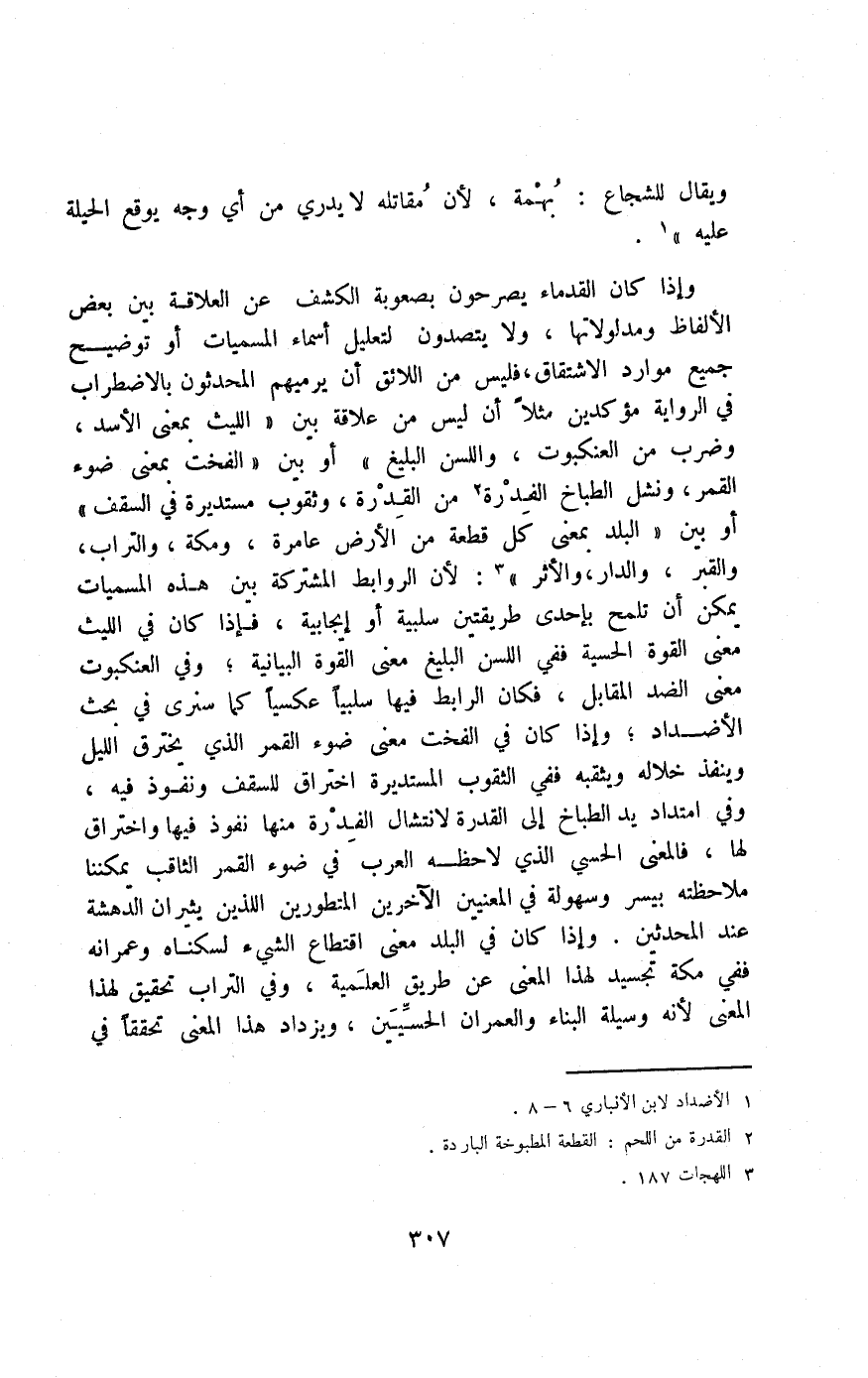 وإذا كان القدماء يصرحون بصعوبة الكشف عن العلاقة بين بعض الألفاظ ومدلولاتها، ولا يتصدون لتعليل أسماء المسميات أو توضيح جميع موارد الاشتقاق، فليس من اللائق أن يرميهم المحدثون بالاضطراب في الرواية مؤكدين مثلًا أن ليس من علاقة بين "الليث بمعنى الأسد، وضرب من العنكبوت، واللسن البليغ" أو بين "الفخت بمعنى ضوء القمر، ونشل الطباخ الفدرة2 من القدرة، وثقوب مستديرة في السقف" أو بين "البلد بمعنى كل قطعة من الأرض عامرة، ومكة، والتراب، والقبر، والدار، والأثر"3 لأن الراوبط المشتركة بين هذه المسميات يمكن أن تلمح بإحدى طريقتين: سلبية أو إيجابية، فإذا كان في الليث معنى القوة الحسية ففي اللسن البليغ معنى القوة البيانية، وفي العنكبوت معنى الضد المقابل، فكان الرابط فيها سلبيًّا عكسيًّا كما سنرى في بحث الأضداد، وإذا كان في الفخت معنى ضوء القمر الذي يخترق الليل وينفذ خلاله ويثقبه ففي الثقوب المستديرة اختراق للسقف ونفوذ فيه، وفي امتداد يد الطباخ إلى القدرة ولانتشال الفدرة منها نفوذ فيها واختراق لها؛ فالمعنى الحسي الذي لاحظه العرب في ضوء القمر الثاقب يمكننا ملاحظته بيسر وسهولة في المعنيين الآخرين المتطورين اللذين يثيران الدهشة عند المحدثين.