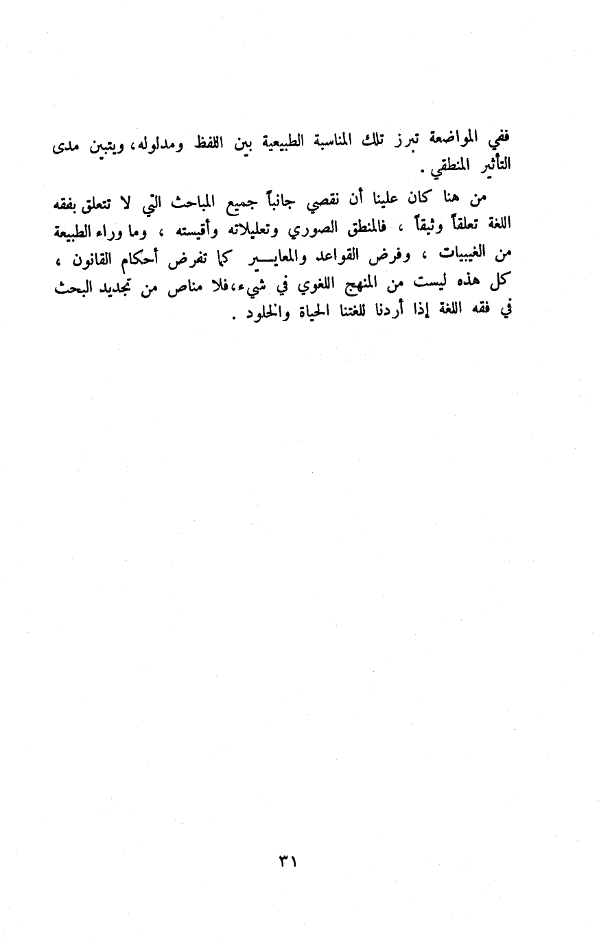 من هنا كان علينا أن نُقَصِّيَ جانبًا جميع المباحث التي لا تتعلق بفقه اللغة تعلقًا وثيقًا، فالمنطق الصوري وتعليلاته وأقيسته، وما وراء الطبيعة من الغيبيات، وفرض القواعد والمعايير كما تفرض أحكام القانون، كل هذه ليس من المنهج اللغوي في شيء، فلا مناص من تجديد البحث في فقه اللعة إذا أردنا للغتنا الحياة والخلود.