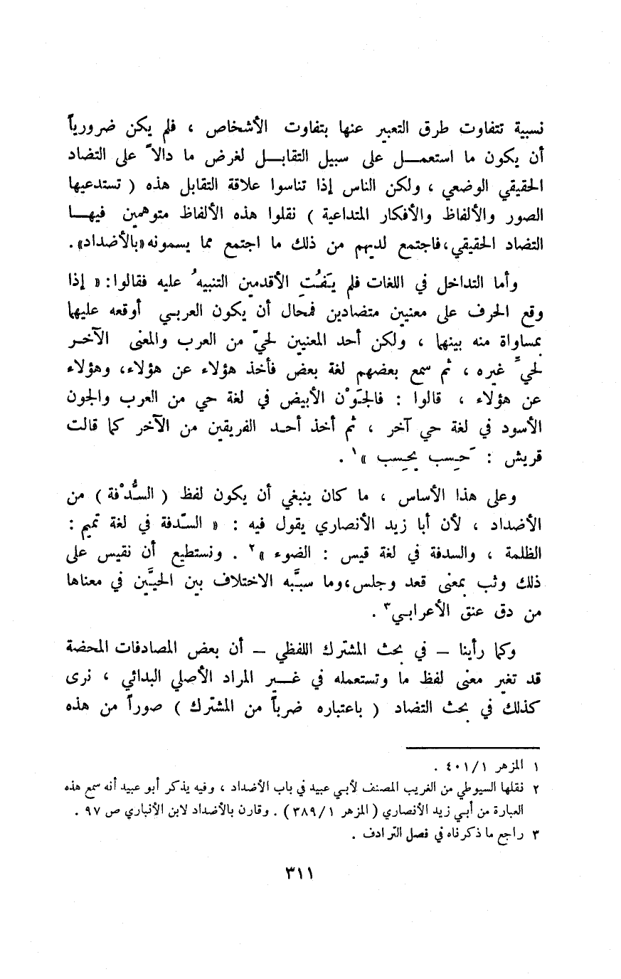 وعلى هذا الأساس ما كان ينبغي أن يكون لفظ "السُّدْفة" من الأضداد؛ لأن أبا زيد الأنصاري يقول فيه: "السدفة في لغة تميم: الظلمة، والسدفة في لغة قيس: الضوء"2. ونستطيع أن نقيس على ذلك وثب بمعنى قعد وجلس، وما سببه الاختلاف بين الحيين في معناها من دق عنق الأعرابي3.