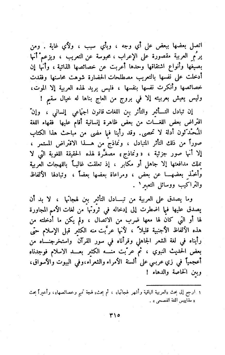 اتصل بعضها ببعض على أي وجه، وبأي سبب، ولأي غاية. ومن يرم العربية مقصورة على الإعراب، محبوسة عن التعريب، ويزعم أنها بصيغها وأنواع اشتقاقها وحدها أعربت عن خصائصها الذاتية، وأنها أن أدخلت على نفسها بالتعريب مصطلحات الحضارة شوهت محاسنها وفقدت خصائصها وأنكرت نفسها بنفسها، فليس يريد لهذه العربية إلا الموت، وليس يعيش بعربيته إلا في بروج من العاج بناها له خيال سقيم!