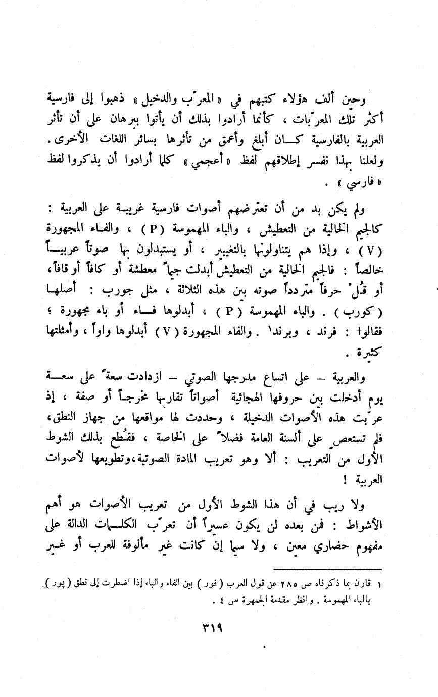 وحين ألف هؤلاء كتبهم في "المعرب والدخيل" ذهبوا إلى فارسية أكثر تلك المعربات، كأنما أرادوا بذلك أن يأتوا ببرهان على أن تأثر العربية بالفارسية كان أبلغ وأعمق من تأثرها بسائر اللغات الأخرى. ولعلنا بهذا نفسر إطلاقهم لفظ "أعجمي" كلما أردوا أن يذكروا لفظ "فارسي".