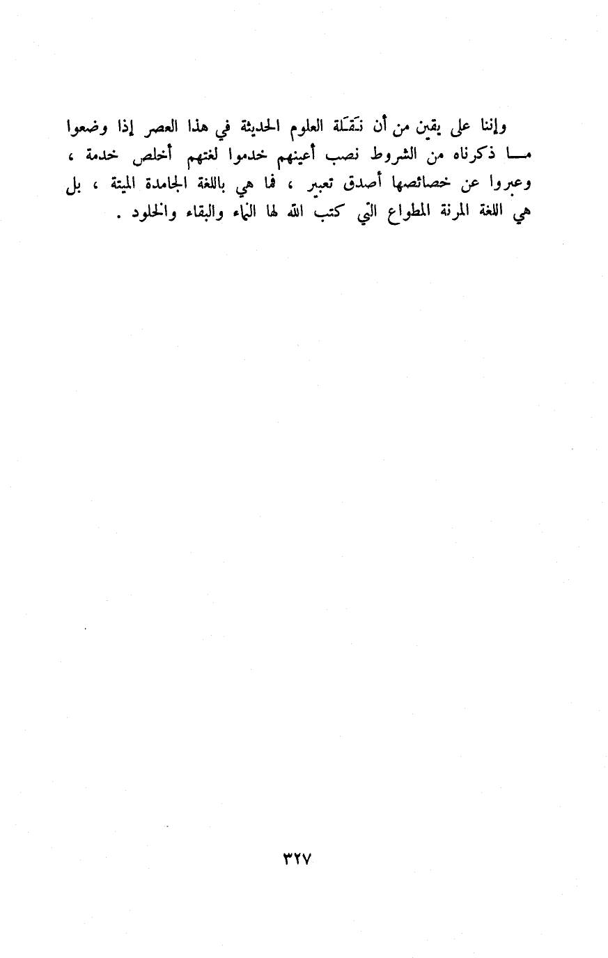 وإننا على يقين من أن نقلة العلوم الحديثة في هذا العصر إذا وضعوا ما ذكرناه من الشروط نصب أعينهم خدموا لغتهم أخلص خدمة، وعبروا عن خصائصها أصدق تعبير، فما هي باللغة الجامدة الميتة، بل هي اللغة المرنة المطواع التي كتب الله لها النماء والبقاء والخلود.
