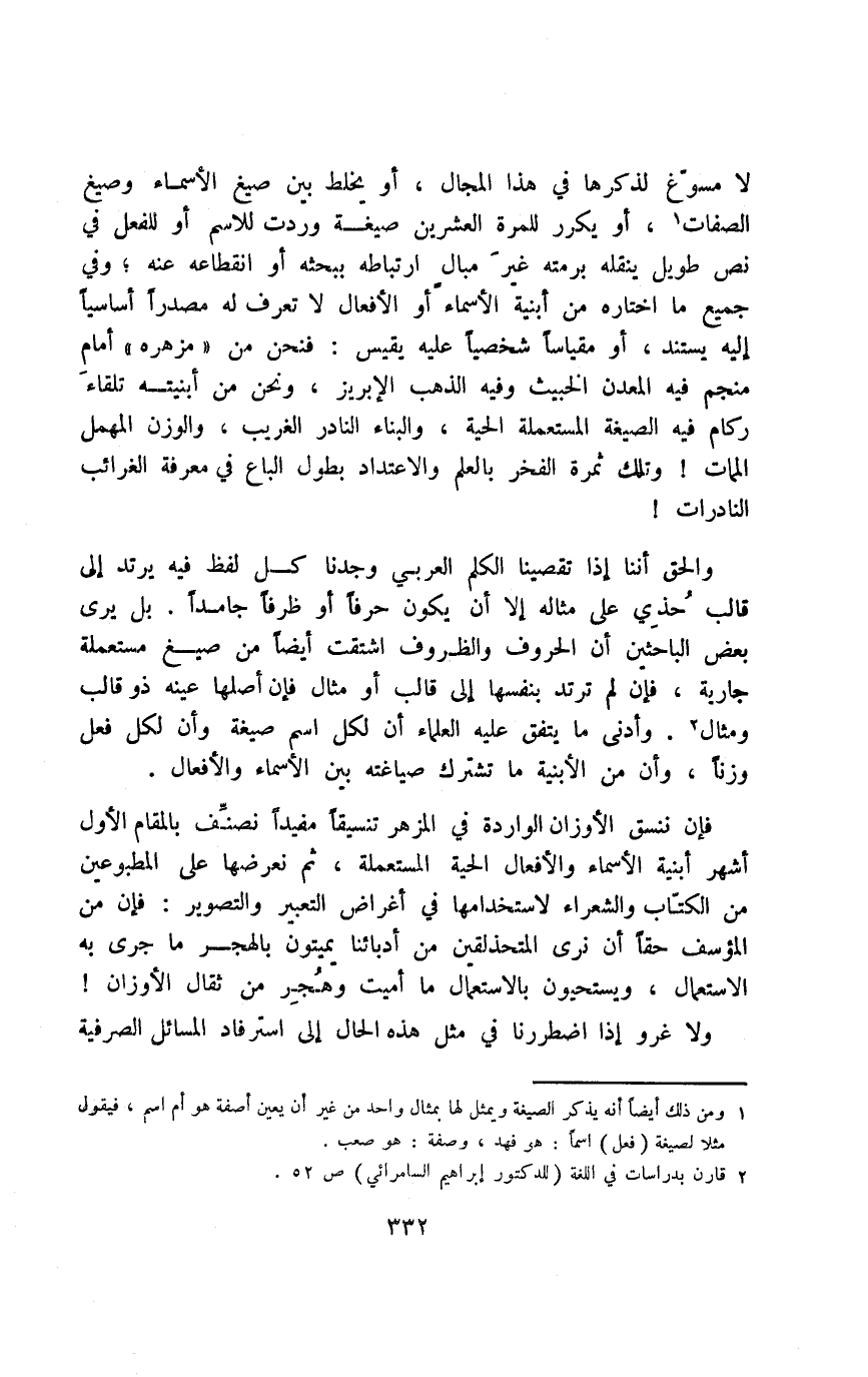 والحق أننا إذا تقصينا الكلم العربي وجدنا كل لفظ فيه يرتد إلى قالب حُذِي على مثاله إلا أن يكون حرفًا أو ظرفًا جامدًا. بل يرى بعض الباحثين أن الحروف والظروف اشتقت أيضًا من صيغ مستعملة جارية، فإن لم ترتد بنفسها إلى قالب أو مثال فإن أصلها عينه ذو قالب ومثال2. وأدنى ما يتفق عليه العلماء أن لكل اسم صيغة وأن لكل فعل وزنًا، وأن من الأبنية ما تشترك صياغته بين الأسماء والأفعال.