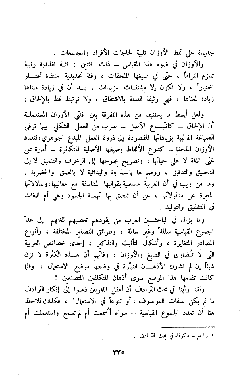وما يزال في الباحثين العرب من يقودهم تعصبهم للغتهم إلى عد الجموع القياسية سالمة وغير سالمة، وطرائق التصغير المختلفة، وأنواع المصادر المتغايرة، وأشكال التأنيث والتذكير، إحدى خصائص العربية التي لا تضارى في الصيغ والأوزان، وفاتهم أن هذه الكثرة لا تزن شيئًا إن لم تشارك الأذهان النيرة في وضعها موضع الاستعمال، وقلما كانت تضعها هذا الموضع سوى أذهان المتكلفين المتصنعين!