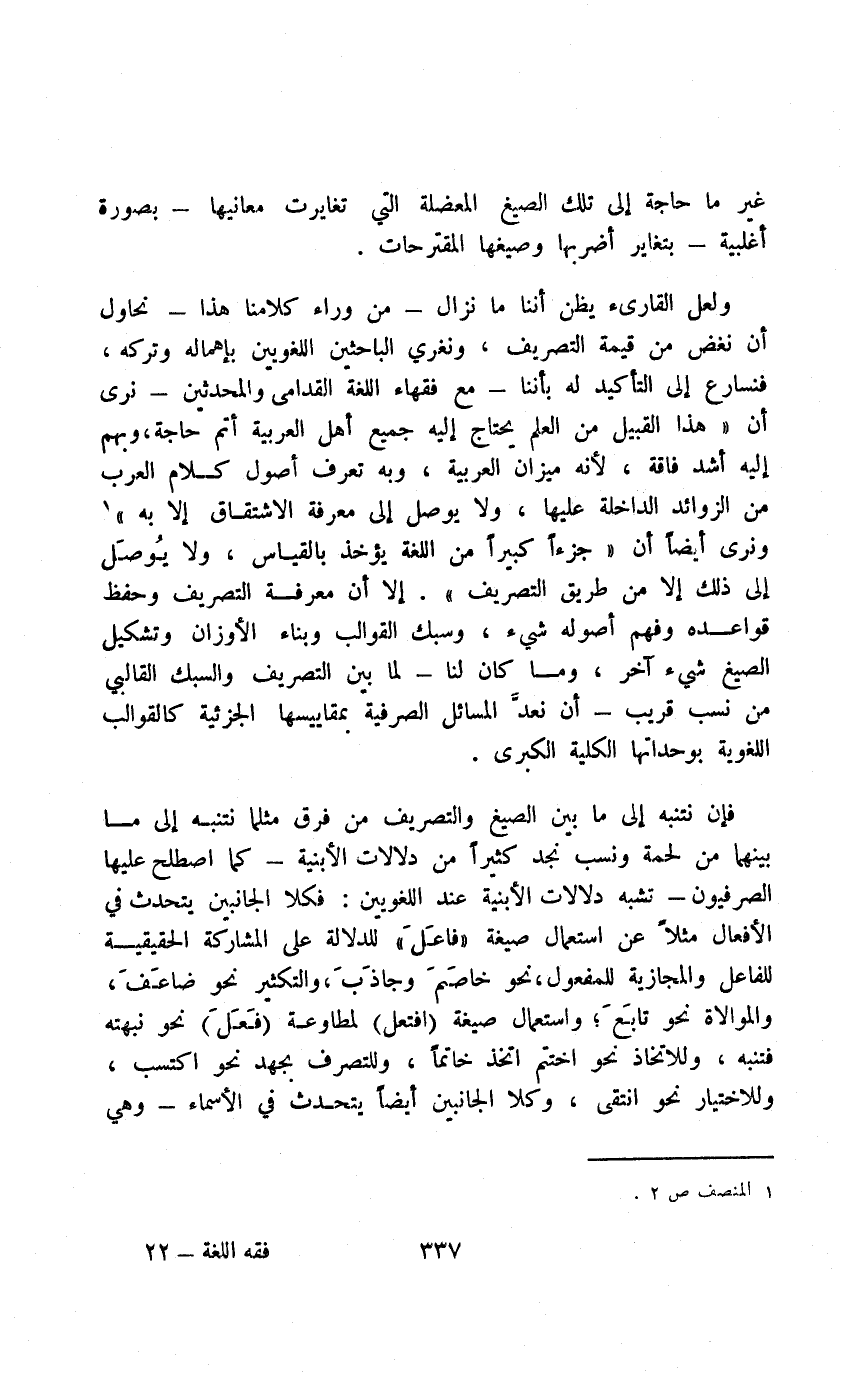 ولعل القارئ يظن أننا ما نزال -من وراء كلامنا هذا- نحاول أن نعض من قيمة التصريف، ونعري الباحثين اللغويين بإهماله وتركه، فنسارع إلى التأكيد له بأننا -مع فقهاء اللغة القدامى والمحدثين- نرى أن "هذا القبيل من العلم يحتاج إليه جميع أهل العربية أتم حاجة، وبهم إليه أشد فاقة؛ لأنه ميزان العربية، وبه تعرف أصول كلام العرب من الزوائد الداخلة عليها، ولا يوصل إلى معرفة الاشتقاق إلا به"1.