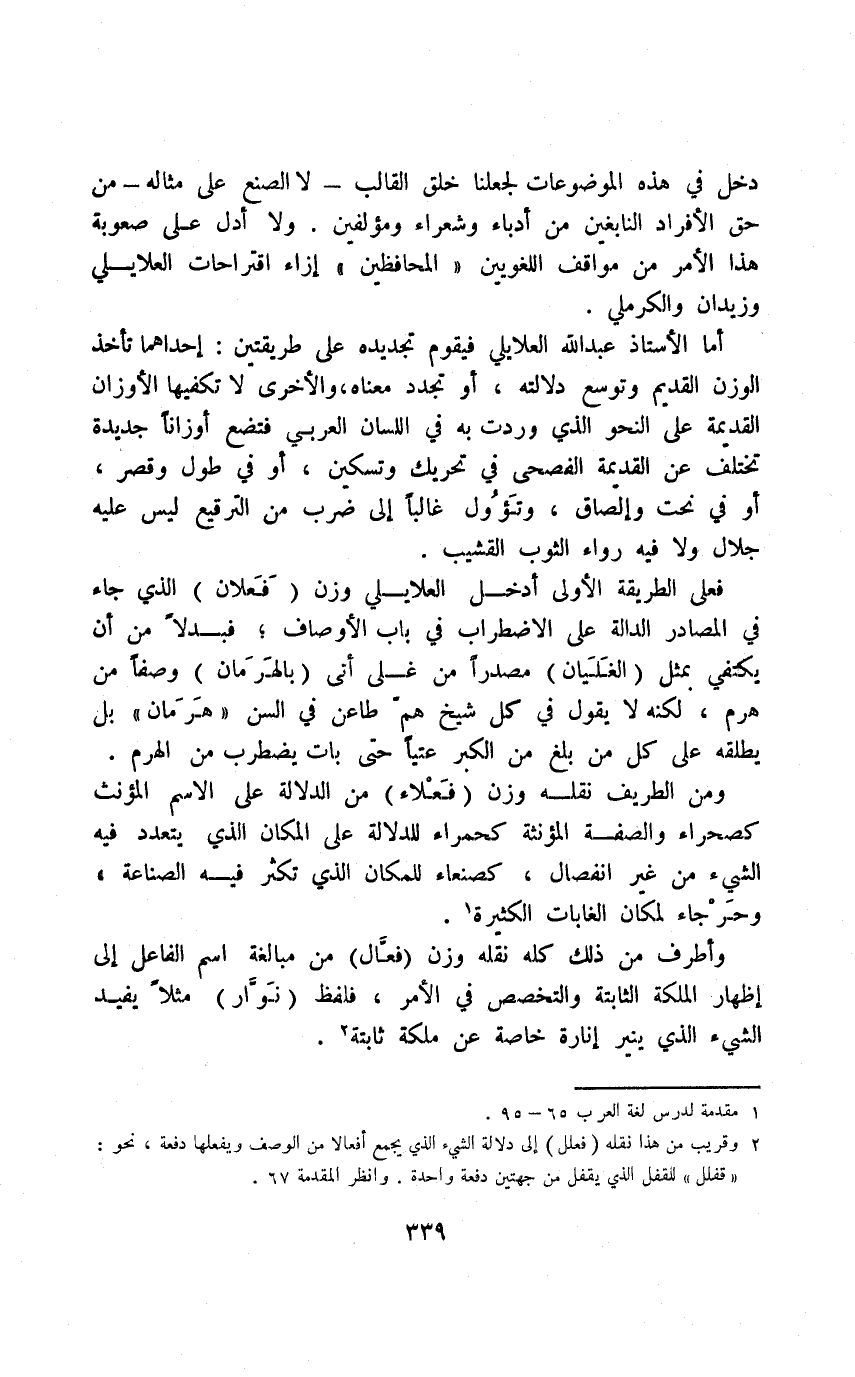 دخل في هذه الموضوعات لجعلنا خلق القالب -لا الصنع على مثاله- من حق الأفراد النابغين من أدباء وشعراء ومؤلفين. ولا أدل على صعوبة هذا الأمر من مواقف اللغويين "المحافظين" إزاء اقتراحات العلايلي وزيدان والكرملي.