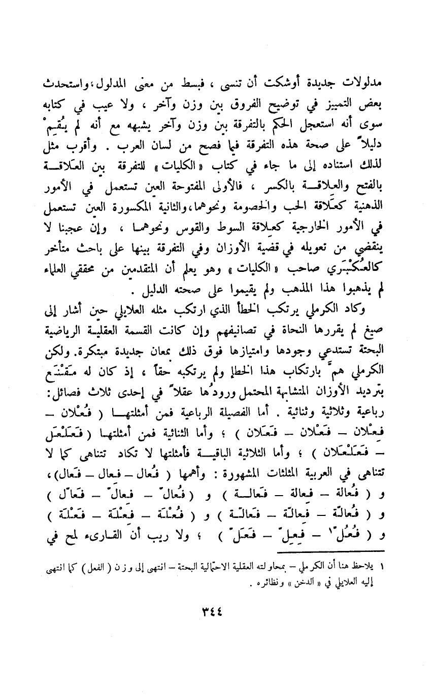 وكاد الكرملي يرتكب الخطأ الذي ارتكب مثله العلايلي حين أشار إلى صيغ لم يقررها النحاة في تصانيفهم وإن كانت القسمة العقلية الرياضية البحتة تستدعي وجودها وامتيازها فوق ذلك بمعان جديدة مبتكرة. ولكن الكرملي هم بارتكاب هذا الخطأ ولم يرتكبه حقًّا؛ إذ كان له مقنع بترديد الأوزان المتشابهة المحتمل ورودها عقلًا في إحدى ثلاث فصائل: رباعية وثلاثثية وثنائية. أما الفصيلة الرباعية فمن أمثلتها "فُعْلان - فِعْلان - فَعْلان - فَعَلان"؛ وأما الثنائية فمن أمثلتها "فَعَلْعَل، فَعَلْعَلان"؛ وأما الثلاثية الباقية فأمثلتها لا تكاد تتناهى كما لا تتناهى في العربية المثلثات المشهورة: وأهمها "فُعال، فِعال، فَعال"، و"فُعالة، فِعالة، فَعالة"، و"فُعالّ، فِعالّ، فَعالّ"، و"فُعالّة، فِعالّة، فَعالّة"، و"فُعْلَة، فِعْلَة، فَعْلَة"، و"فُعُل1، فِعِل، فَعَل"؛ ولا ريب أن القارئ لمح في