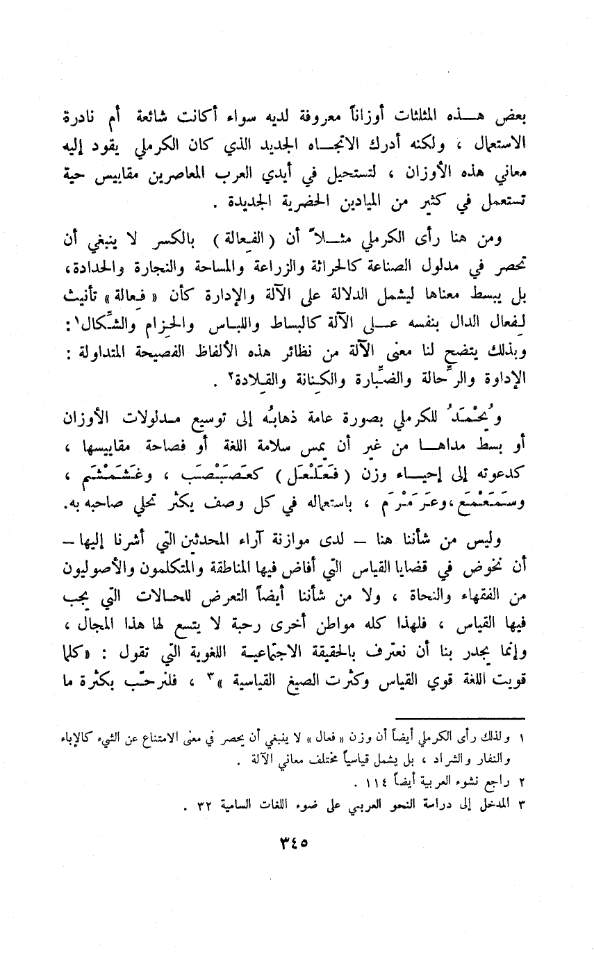 1 ولذلك رأى الكرملي أيضًا أن وزن "فعال" لا ينبغي أن يحصر في معنى الامتناع عن الشيء كالإباء والنفار والشراد، بل يشمل قياسيًّا مختلف معاني الآلة.