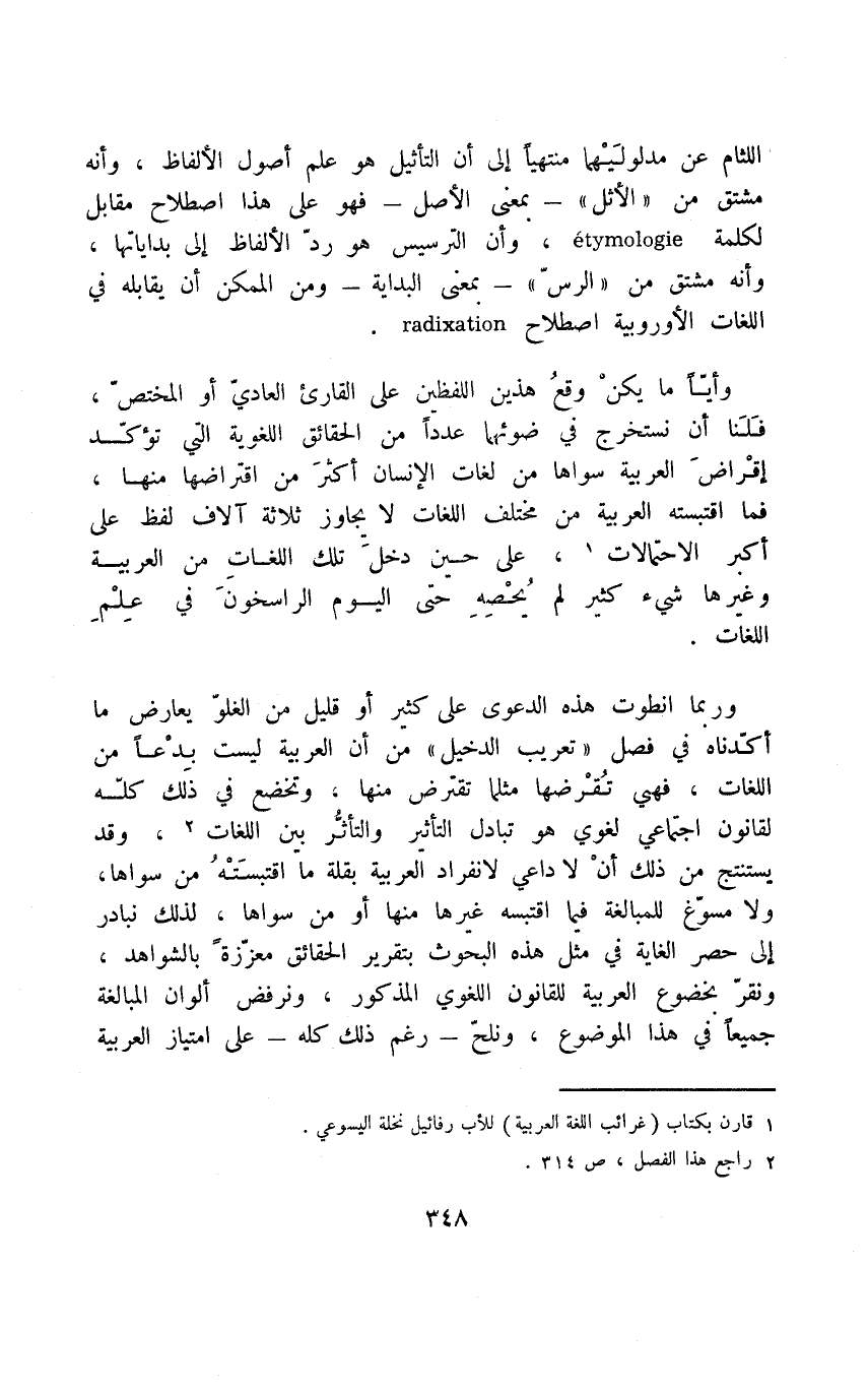 وربما انطوت هذه الدعوى على كثير أو قليل من الغلو يعارض ما أكدناه في فصل "تعريب الدخيل" من أن العربية ليست بدعًا من اللغات، فهي تقرضها مثلما تقترض منها، وتخضع في ذلك كله لقانون اجتماعي لغوي هو تبادل التأثير والتاثر بين اللغات2 وقد يستنتج من ذلك أن لا داعي لانفراد العربية بقلة ما اقتبسته من سواها، ولا مسوغ للمبالغة فيما اقتبسه غيرها منها أو سواها؛ لذلك نبادر إلى حصر الغاية في مثل هذه البحوث بتقرير الحقائق معززة بالشواهد، ونقر بخضوع العربية للقانون اللغوي المذكور، ونرفض ألوان المبالغة جميعًا في هذا الموضوع، ونلح -رغم ذلك كله- على امتياز العربية