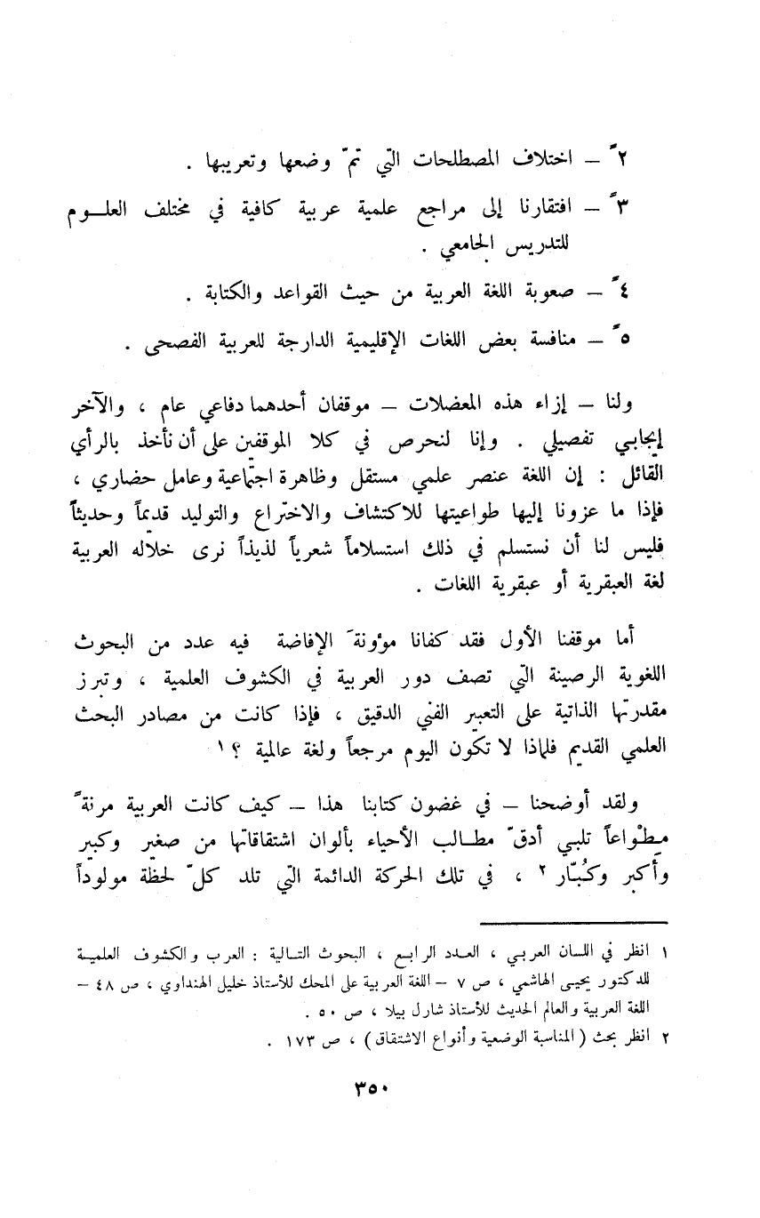 1 انظر في اللسان العربي، العدد الرابع، البحوث التالية: العرب والكشوف العلمية الدكتور يحيى الهاشمي ص7، اللغة العربية على المحك للأستاذ خليل الهنداوي ص48، اللغة العربية والعالم الحديث للأستاذ شارل بيلا ص50.