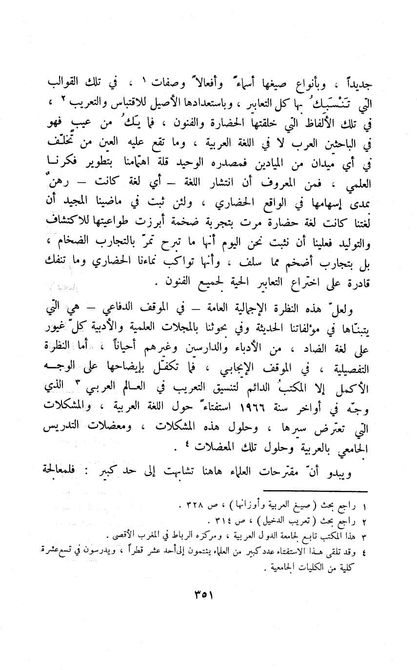 ولعل هذه النظرة الإجمالية العامة -في الموقف الدفاعي- هي التي يتبناها في مؤلفاتنا الحديثة وفي بحوثنا بالمجلات العلمية والأدبية كل غيور على لغة الضاد، من الأدباء والدارسين وغيرهم أحيانًا، أما النظرة التفصيلية، في الموقف الإيجابي، فما تكفل بإيضاحها على الوجه الأكمل إلا المكتب الدائم لتنسيق التعريب في العالم العربي3 الذي وجه في أواخر سنة 1966 استفتاء حول اللغة العربية، والمشكلات التي تعترض سيرها، وحلول هذه المشكلات، ومعضلات التدريس الجامعي بالعربية، وحلول تلك المعضلات4.