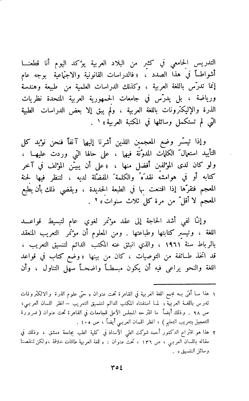 1 هذا ما أفتى به مجمع اللغة العربية في القاهرة تحت عنوان "حتى علوم الذرة والإلكترونات تدرس باللغة العربية" لما استفتاه المكتب الدائم لتنسيق التعريب، انظر اللسان العربي ص98. وذلك أيضًا ما اقترحه المجلس الأعلى للجامعات في القاهرة تحت عنوان "ضرورة التعجيل بتعريب التعليم" انظر اللسان العربي أيضًا ص105.