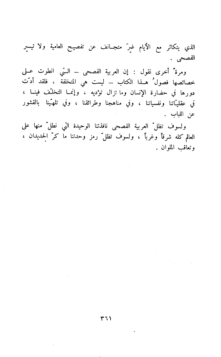 ومرة أخرى نقول: إن العربية الفصحى -التي انطوت على خصائصها فصول هذا الكتاب- ليست هي المتخلفة، فلقد أدت دورها في حضارة الإنسان وما تزال تؤديه، وإنما التخلف فينا، في عقلياتنا ونفسياتنا، وفي مناهجنا وطرائقنا، وفي تلهينا بالقشور عن اللباب.