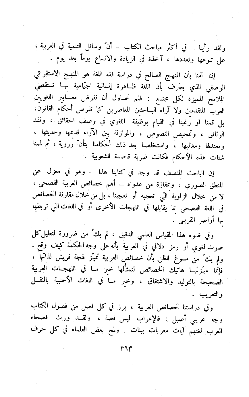 إن الباحث المنصف قد وجد في كتابنا هذا -وهو في معزل عن المنطق الصوري، وبمفازة من عدواه- أهم خصائص العربية الفصحى، لا من خلال الزاوية التي تعبجه أو تعجبنا، بل من خلال مقارنة الخصائص في اللغة الفصحى بما يقابلها في اللهجات الأخرى أو في اللغات التي تربطها بها أواصر القربى.