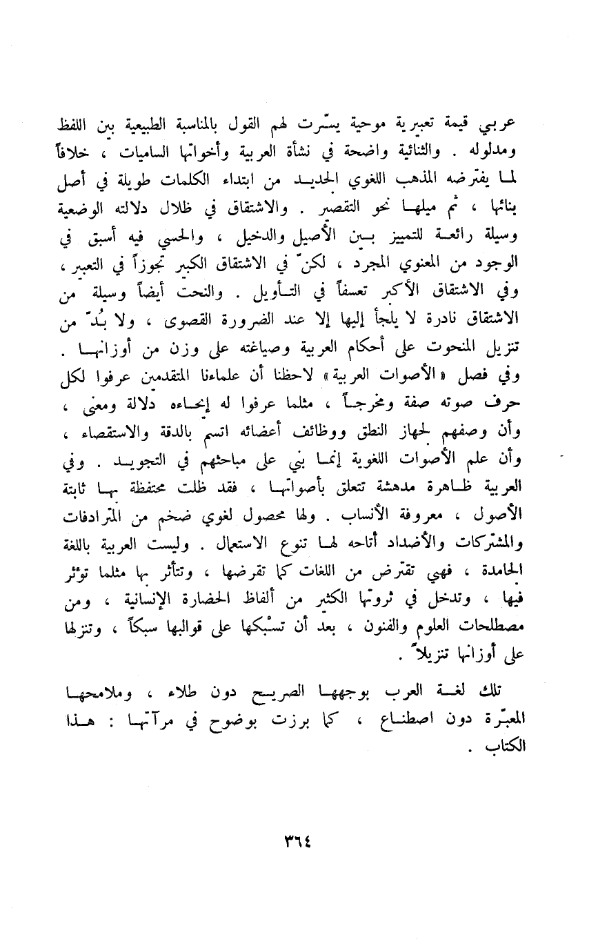عربي قيمة تعبيرية موحية يسرت لهم القول بالمناسبة الطبيعية بين اللفظ ومدلوله. والثنائية واضحة في نشأة العربية وأخواتها الساميات، خلافًا لما يفترضه المذهب اللغوي الجديد من ابتداء الكلمات طويلة في أصل بنائها، ثم ميلها نحو التقصير. والاشتقاق في ظلال دلالته الوضعية وسيلة رائعة للتمييز بين الأصيل والدخيل، والحسي فيه أسبق في الوجود من المعنوي المجرد، لكن في الاشتقاق الكبير تجوزًا في التعبير، وفي الاشتقاق الأكبر تعسفًا في التأويل. والنحت أيضًا وسيلة من الاشتقاق نادرة لا يلجأ إليها إلا عند الضرورة القصوى, ولا بد من تنزيل المنحوت على أحكام العربية وصياغته على وزن من أوزانها.