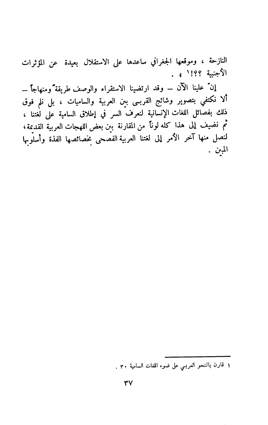 إن علينا الآن -وقد ارتضينا الاستقراء والوصف طريقة ومنهاجًا- ألَّا نكتفي بتصوير وشائج القربى بين العربية والساميات، بل نلم فوق ذلك بفصائل اللغات الإنسانية لنعرف السر في إطلاق السامية على لغتنا، ثم نضيف إلى هذا كله لونًا من المقارنة بين بعض اللهجات العربية القديمة، لنصل منها آخر الأمر إلى لغتنا العربية الفصحى بخصائصها الفذة وأسلوبها المبين.