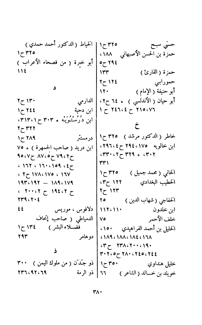 ابن دريد "صاحب الجمهرة" * 75 ح2، 79 ح5، 87 ح7، 95 ح4، 159، 160، 162، 167، 175، 178 ح2، 179، 189-192، 193 ح2، 194 ح2، 200، 204، 239